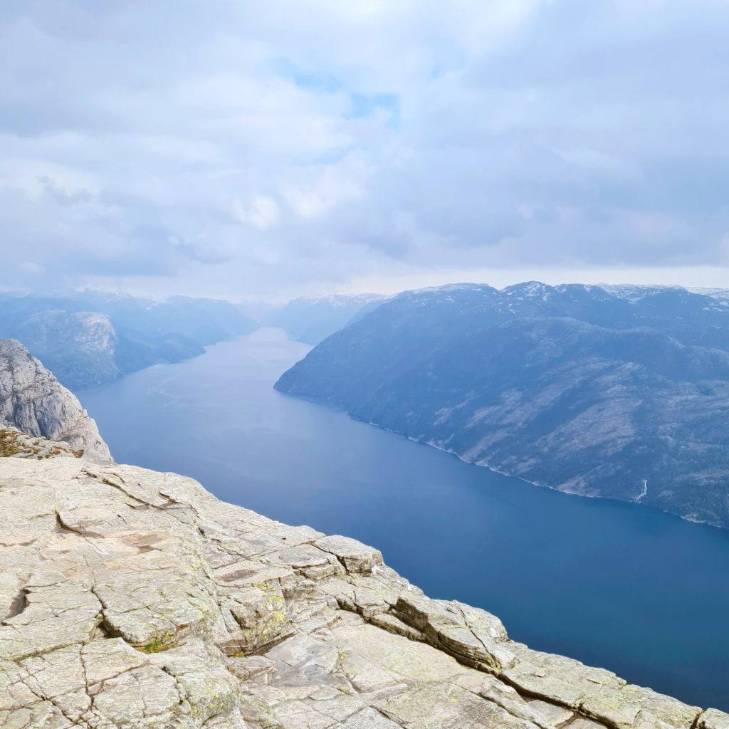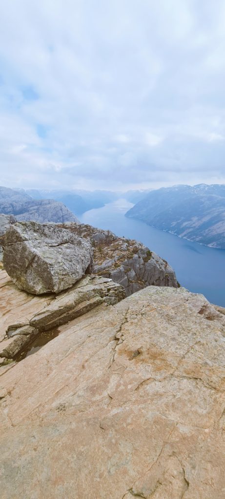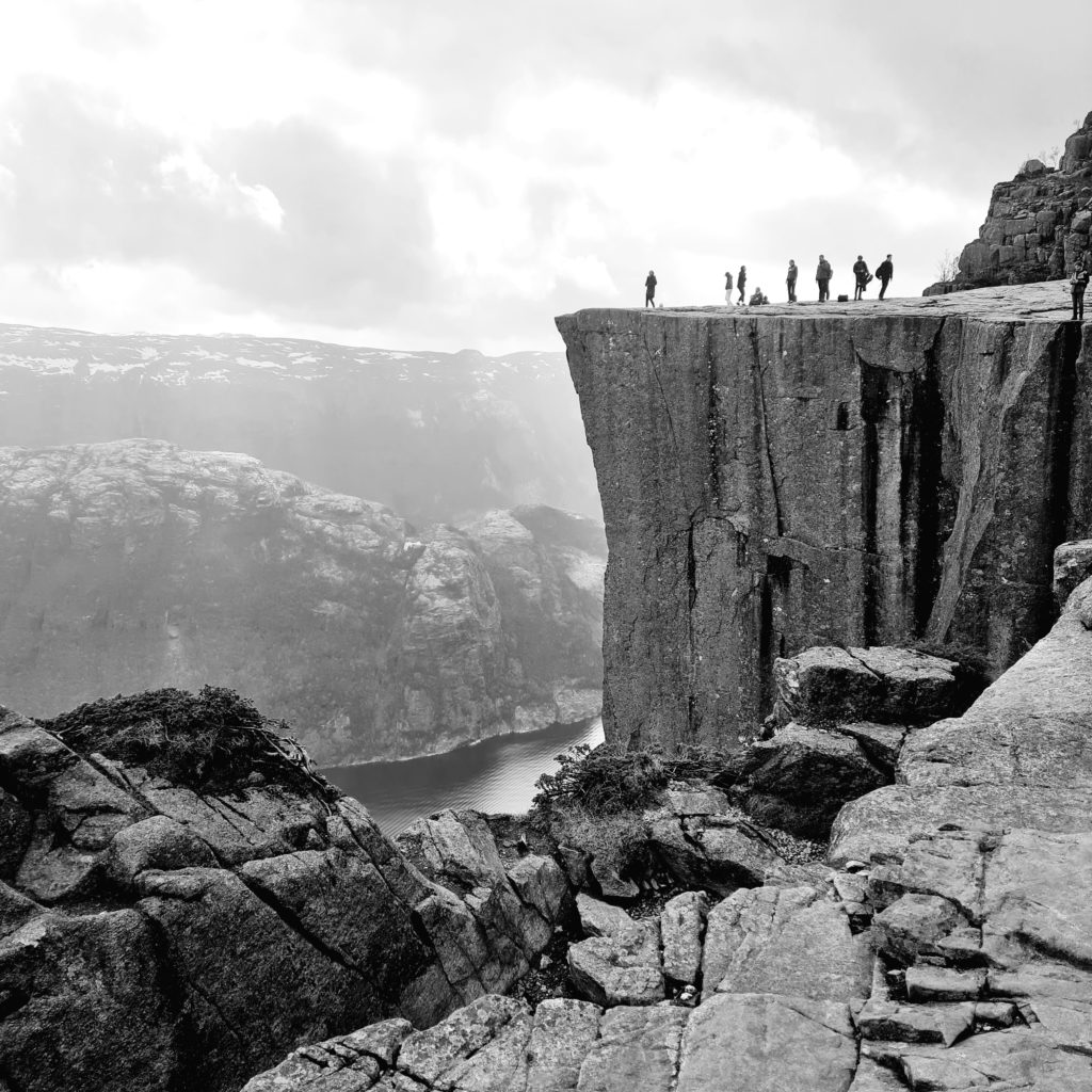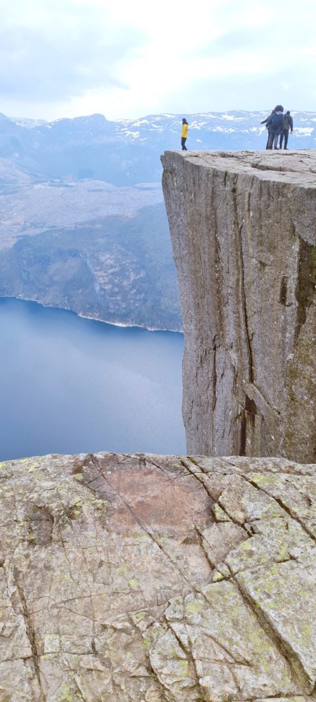 Plus on monte, plus le chemin est sécurisé car nous longeons la falaise jusqu’au point culminant, un roc taillé net dans un à-pic vertigineux, surplombant le Lysefjord. Là-haut, une plate-forme, sans garde-fou, où il faut ramper si l’on veut voir ce qui se passe en bas !