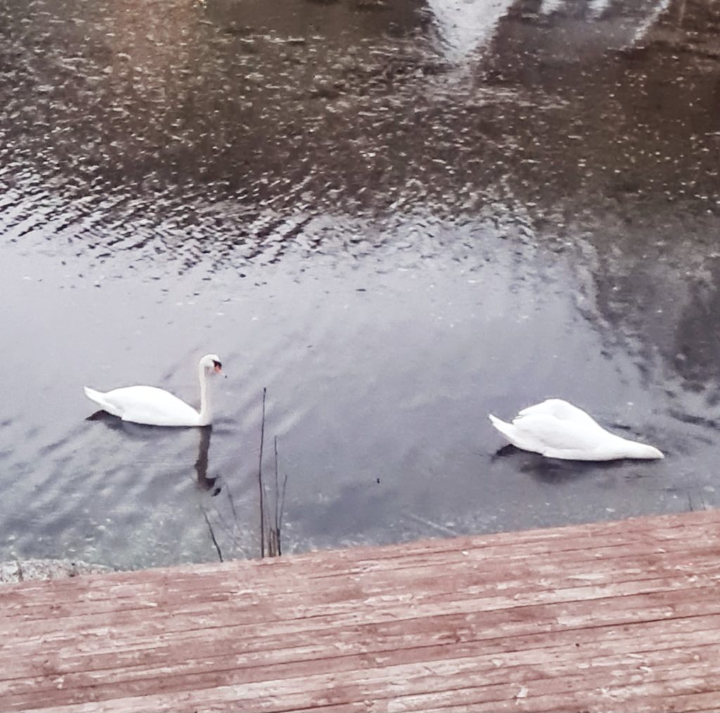 A mi-chemin, nous nous arrêtons pour la nuit près d’un port, sur une aire privée pour camping-cars, histoire de se brancher et de se prendre une douche bien brûlante après la longue journée que nous avons eue. La vue est adorable, nous avons même un petit ponton privé où des cygnes viennent s’approcher.