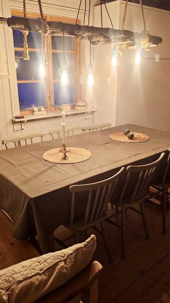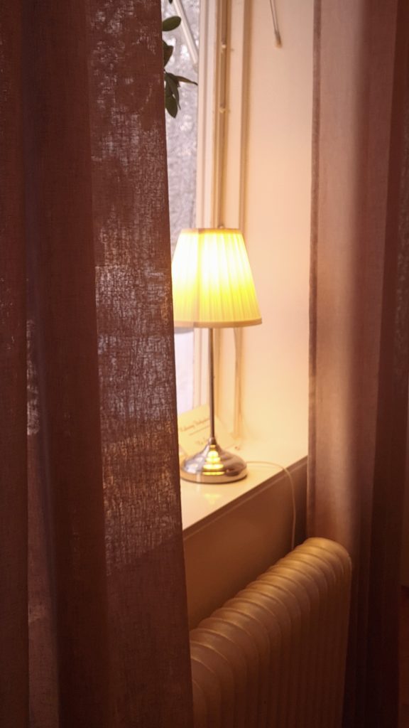 Des bougies partout, des couleurs douces, des lampes posées devant chaque fenêtre, du bois blond, tout est chaleureux et cosy, j’adore vraiment ! Et dehors, un paysage enchanteur qui varie de couleur avec le lever du soleil, passant du rose au doré. Ouahhhh