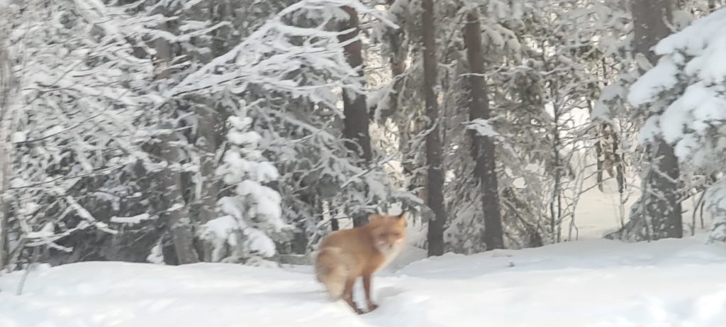 Nous croisons un énorme renard, au bord de la route, qui nous observe avant de s’enfuir.