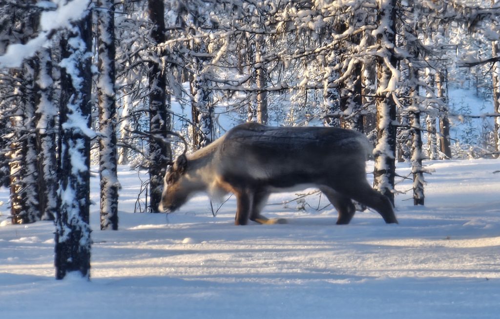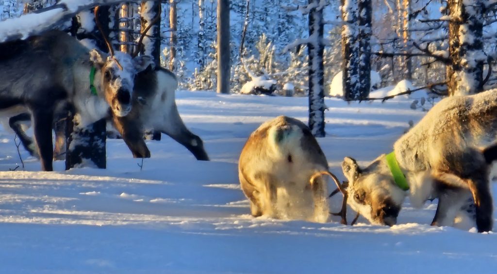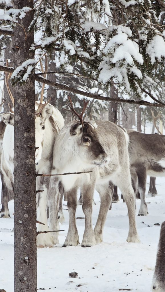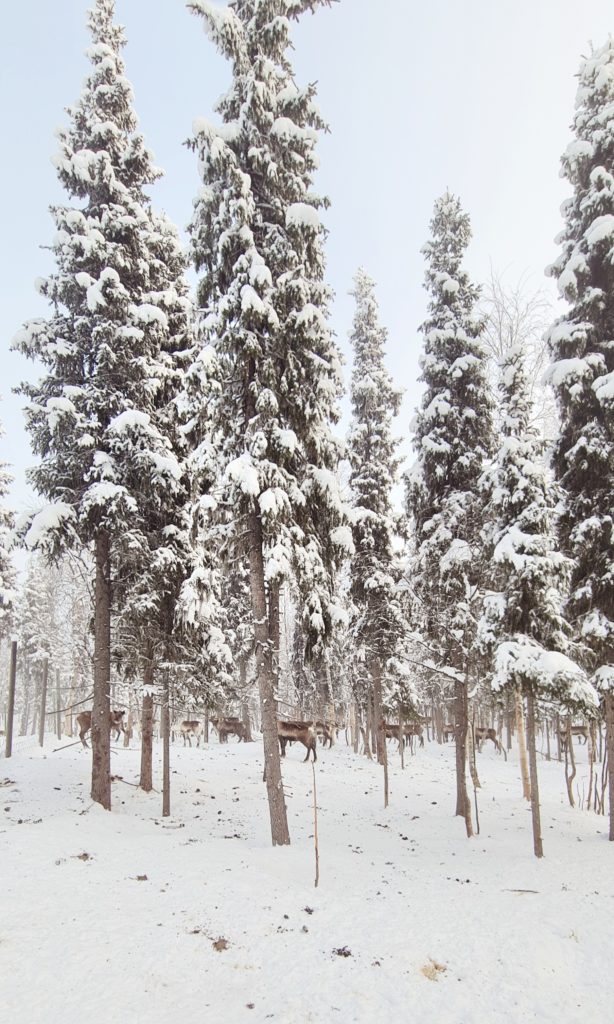 Un peu plus loin, c’est un groupe de rennes en liberté, mais avec des colliers, que nous croisons près de la forêt. Quelle chance de les voir comme ça !