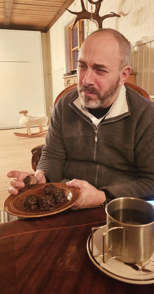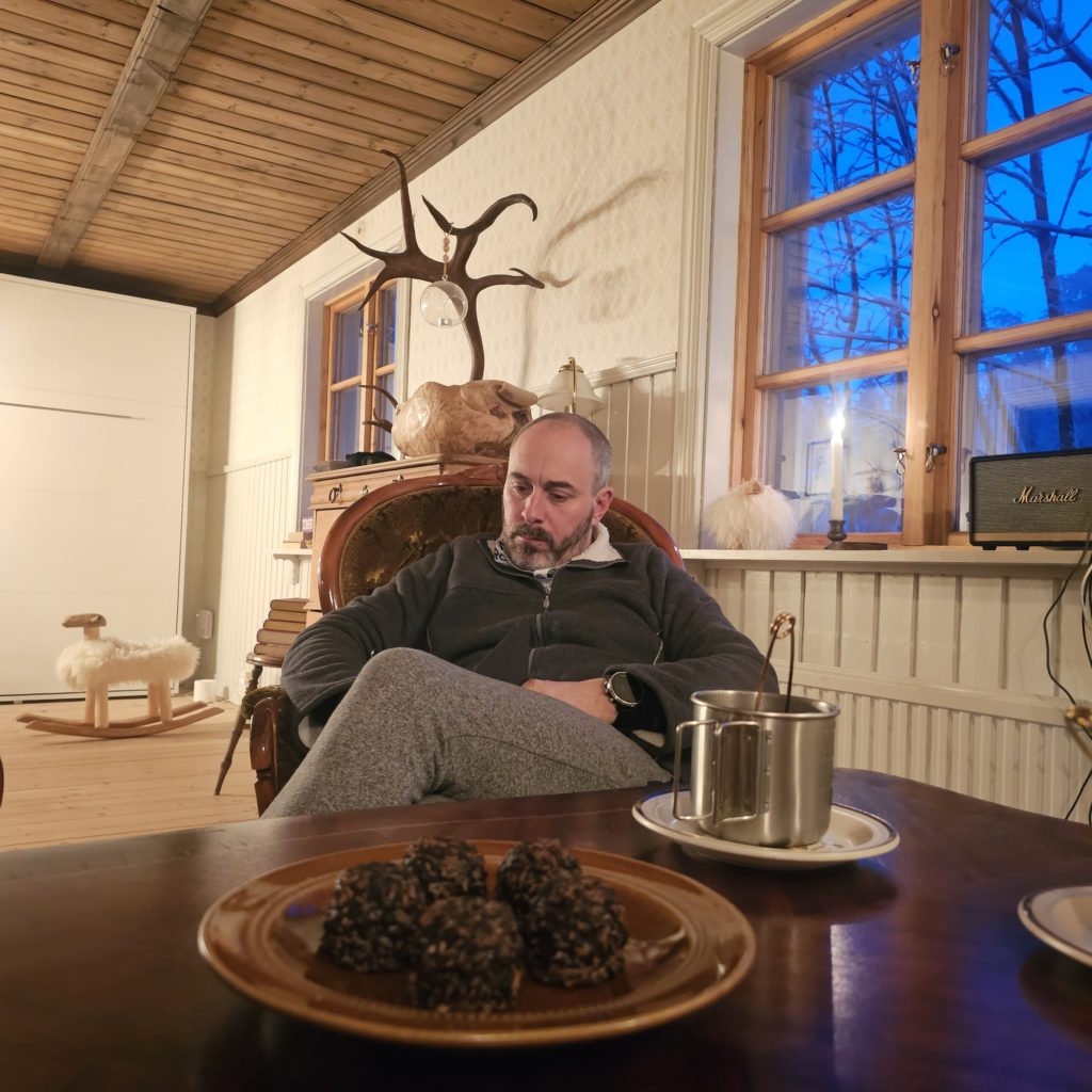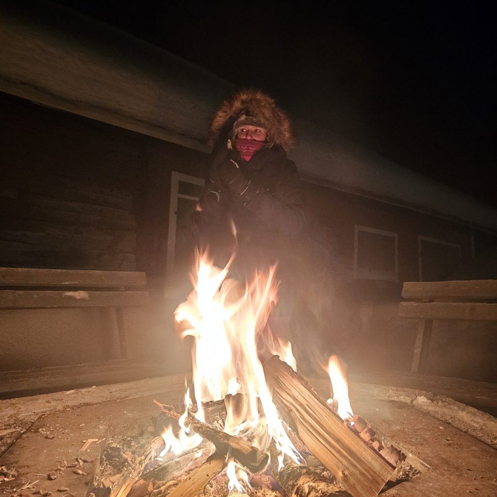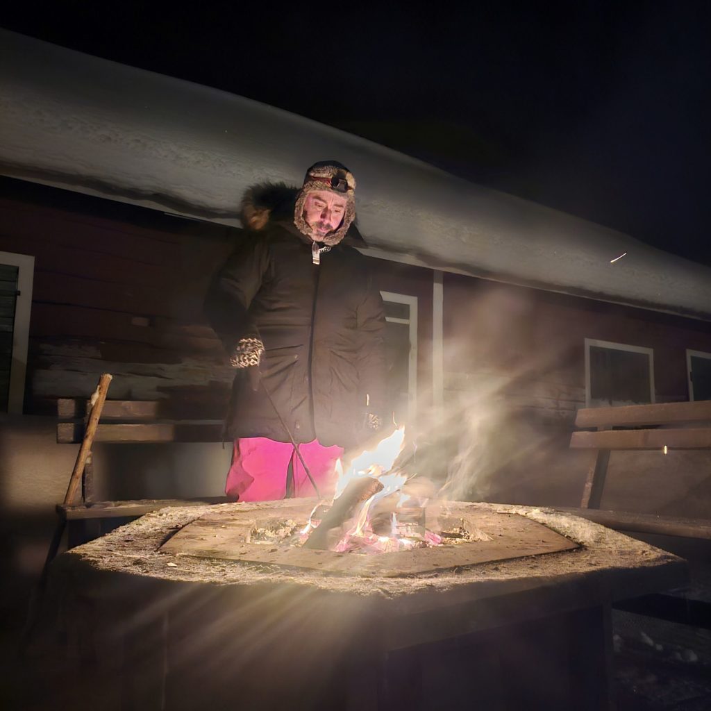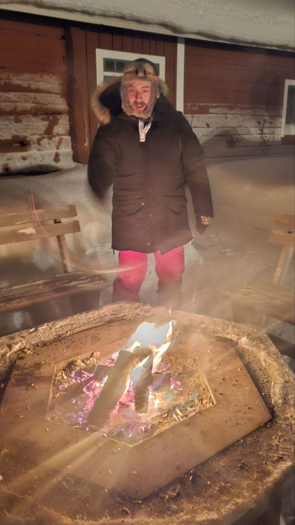 Michael, notre hôte très sympathique, nous accueille et nous fait la présentation des lieux. Chemins de randonnées, sauna, raquettes, skis, traineaux, l’endroit où l’on peut voir les lièvres des neiges, barbecue et brasero extérieur pour attendre les aurores boréales…tout est là !