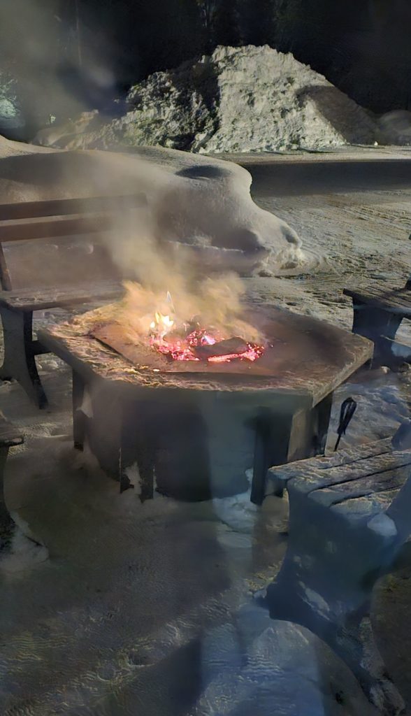 Après un moment passé près de la cheminée à lire, nous décidons de tester le brasero dehors. Le feu prend très vite, on en profite pour s’installer le temps de goûter une bière sous les étoiles.