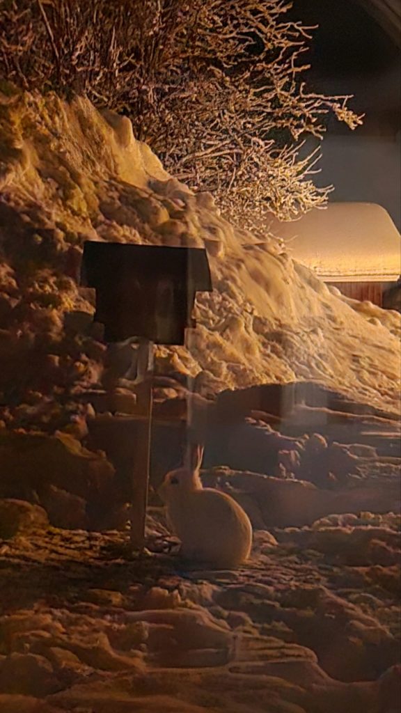 Il est 22h, nous éteignons toutes les lumières de la maison pour voir si, déjà de l’intérieur, nous apercevons quelque chose. La seule chose que nous voyons, c’est Lapinou qui s’est remis à grignoter devant notre fenêtre !