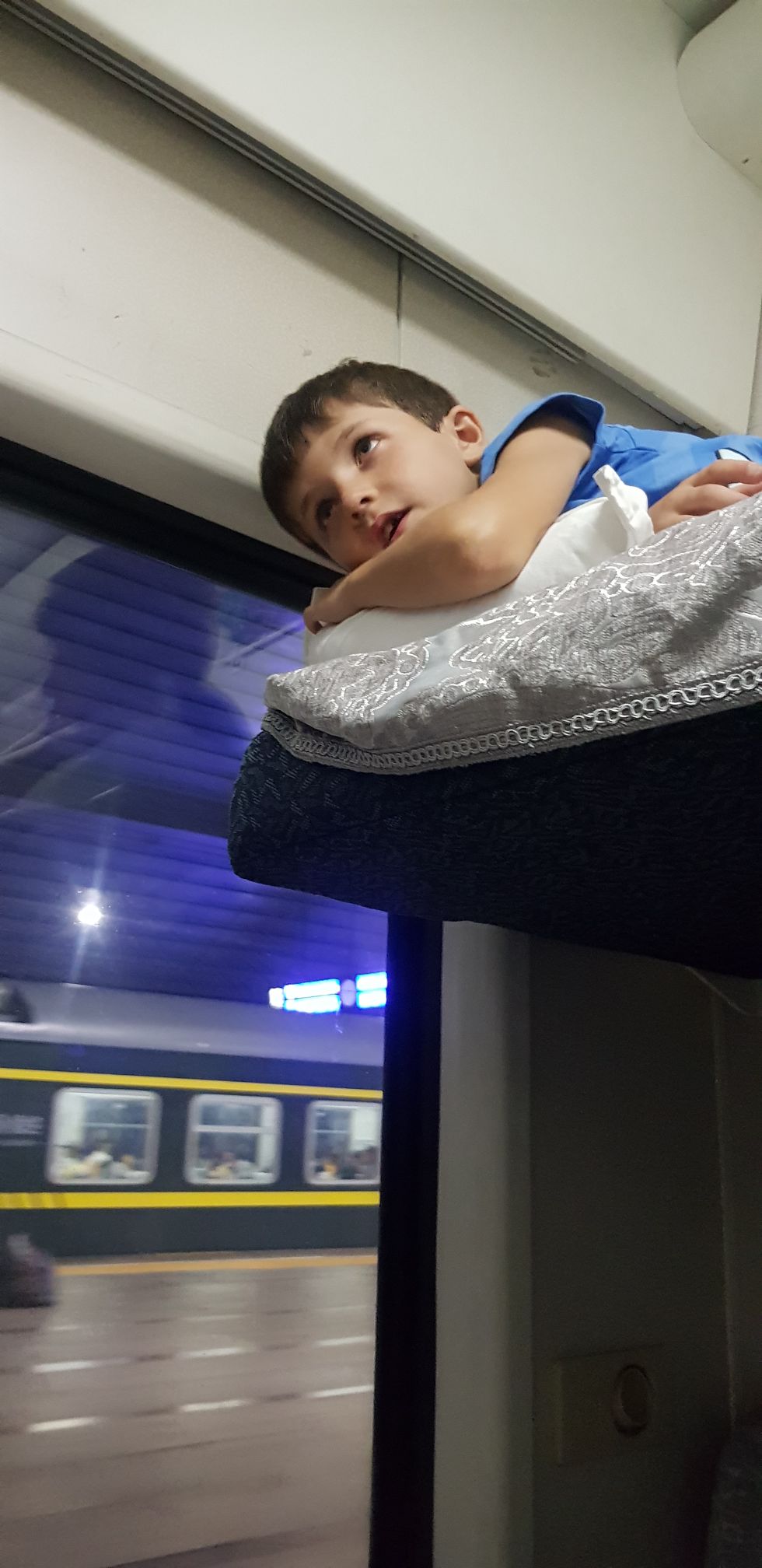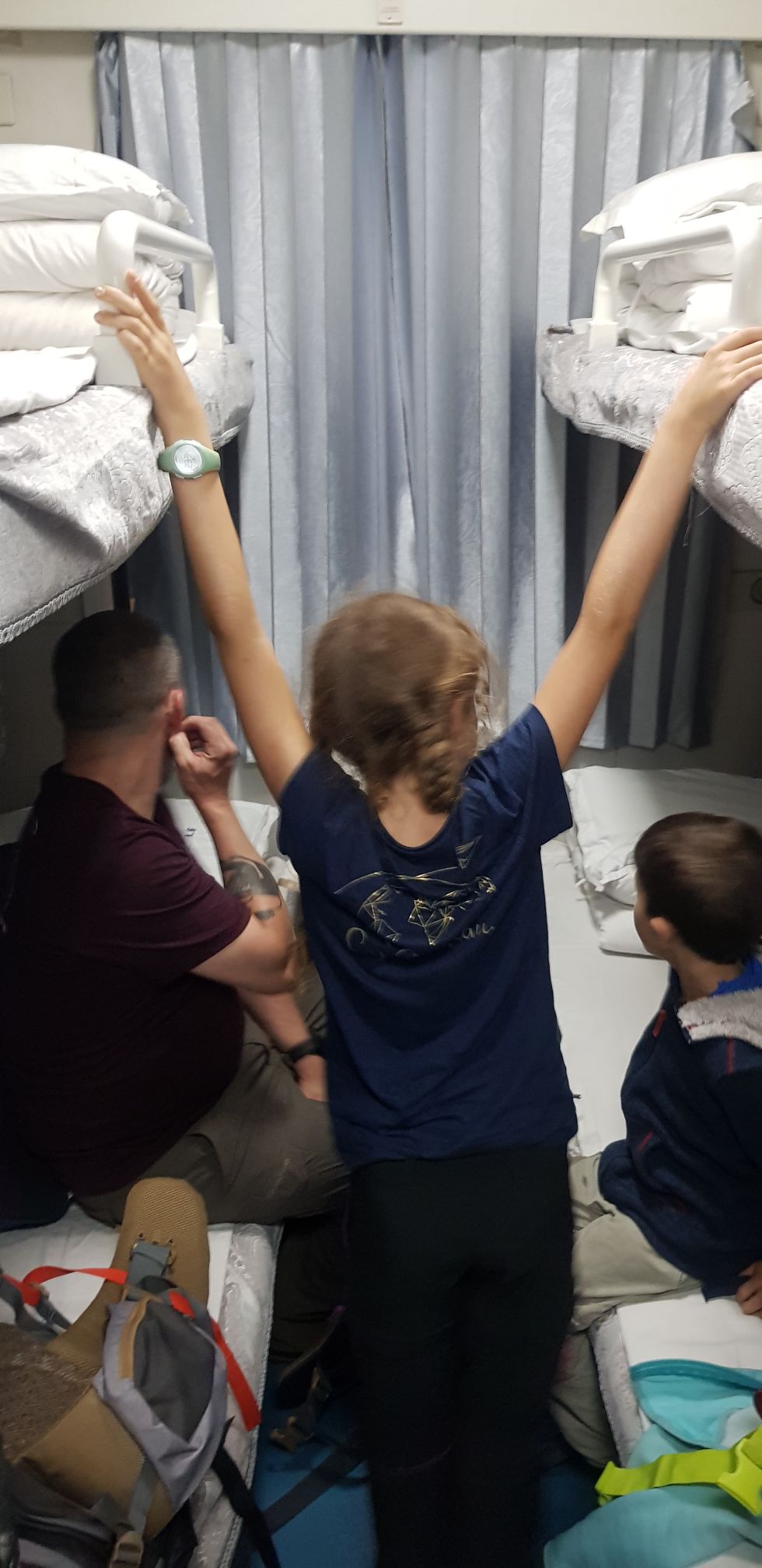 Une fois montés à bord du train, et accompagnés d’un monsieur super gentil avec qui nous avons sympathisé dans la gare, nous découvrons notre compartiment (privé pour ce trajet) avec nos 4 couchettes superposées. Les enfants sont ravis !!