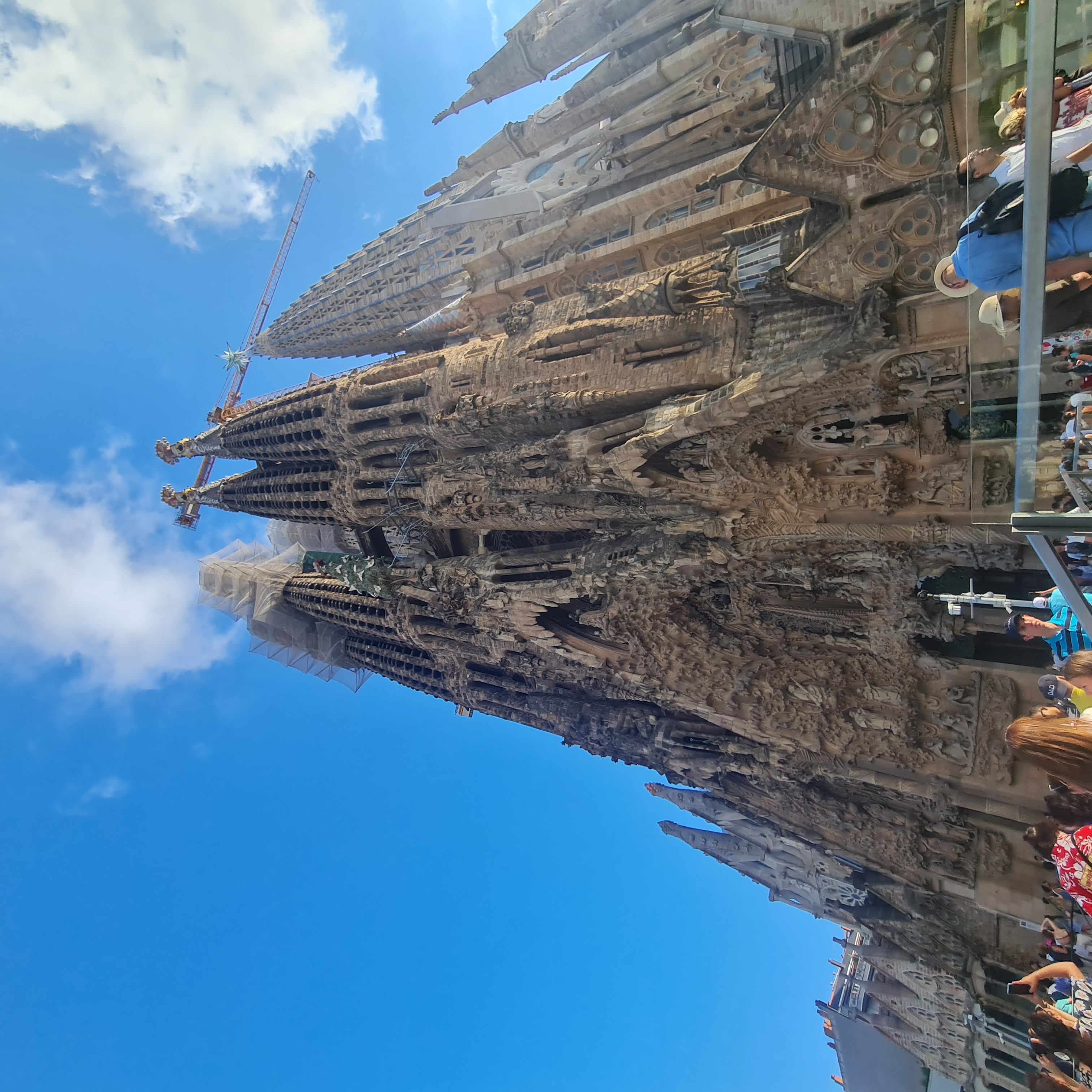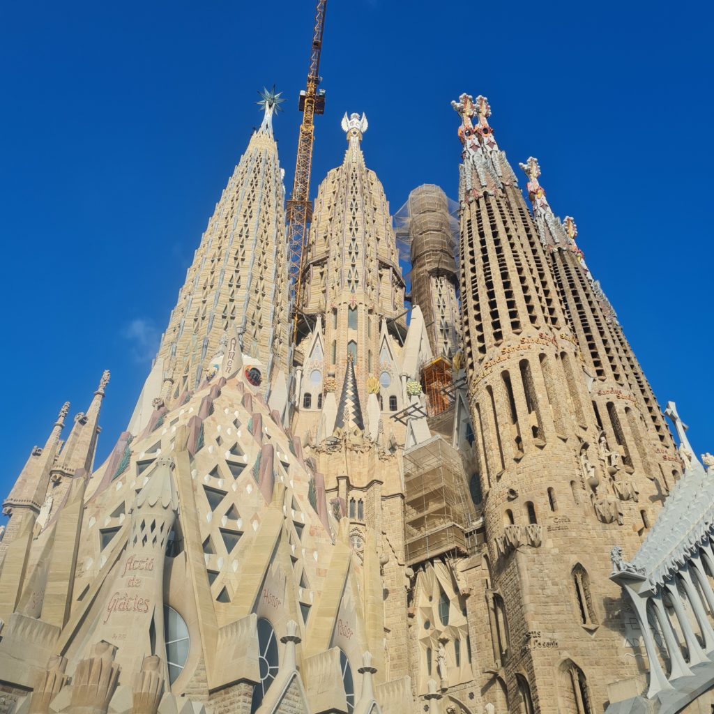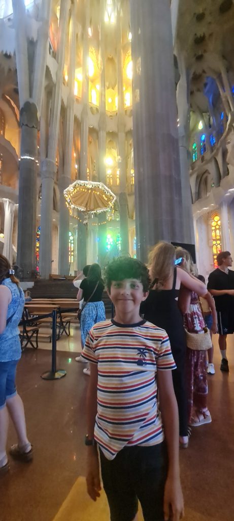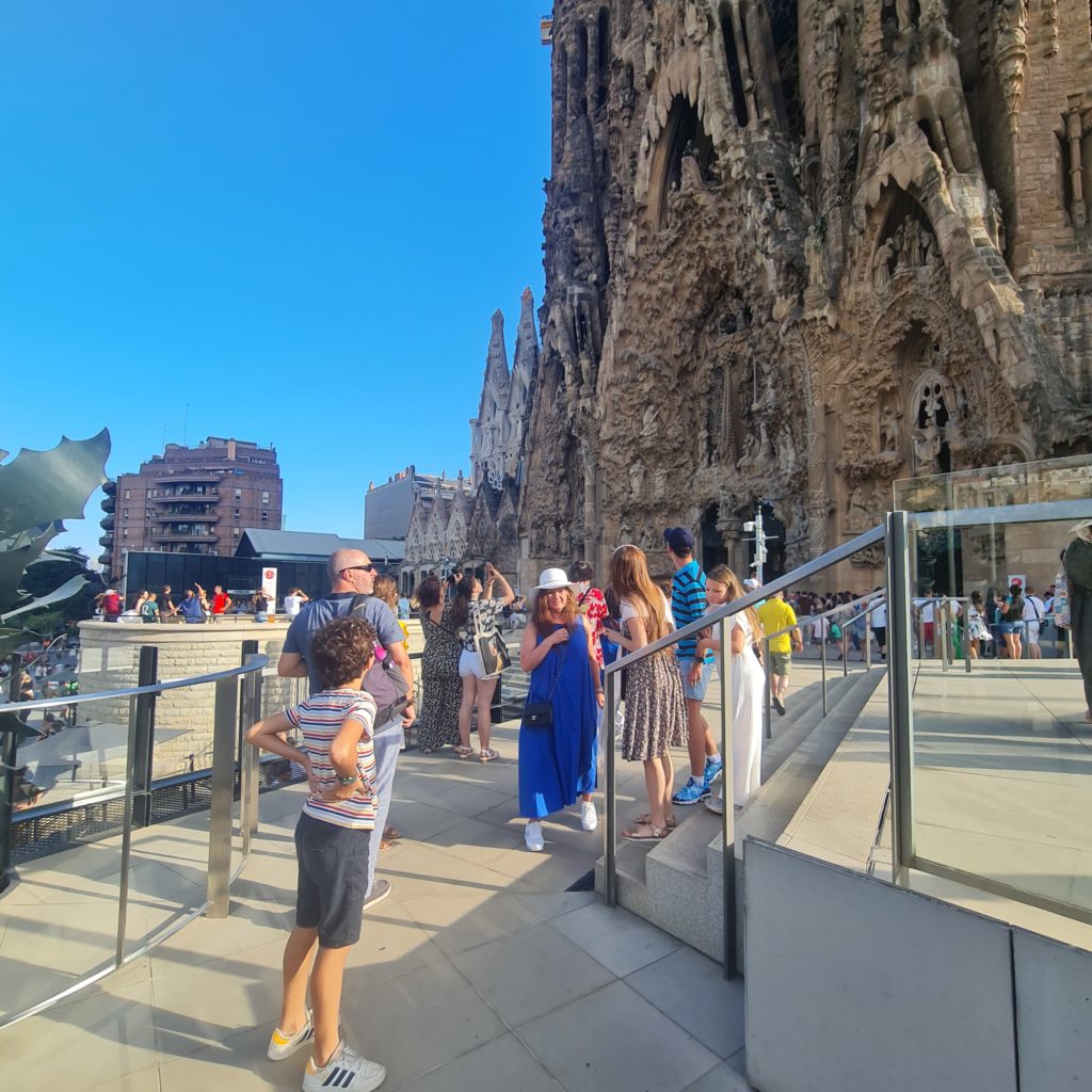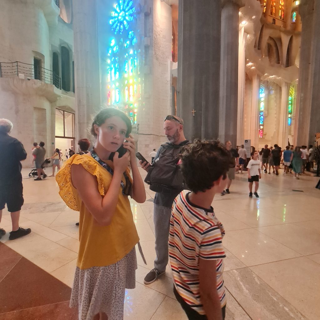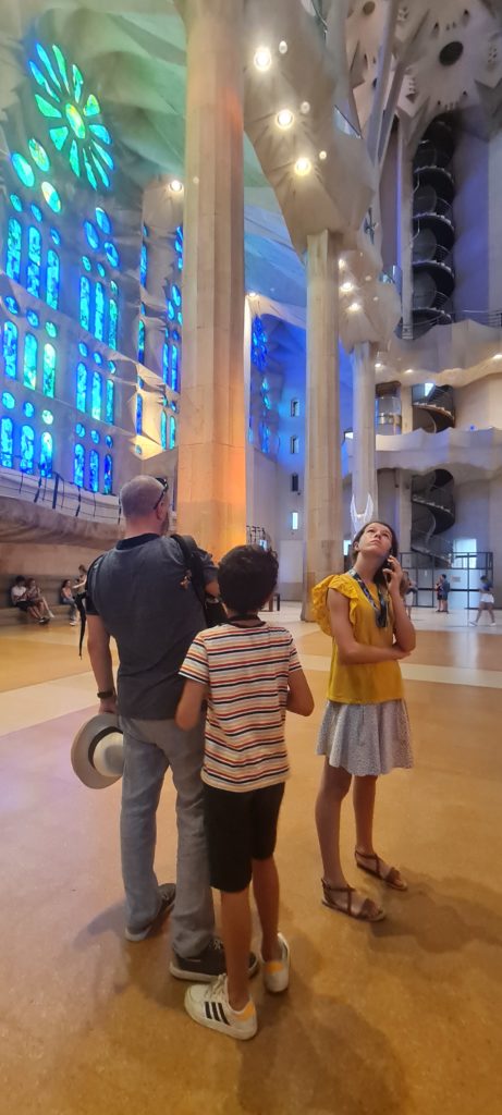 Arrivés sur le parvis, que c’est beau ! Les enfants tiennent à télécharger l’audio-guide pour connaître l’histoire de la Sagrada. Il y a une maquette de l’église une fois terminée, il ne manque plus grand-chose.