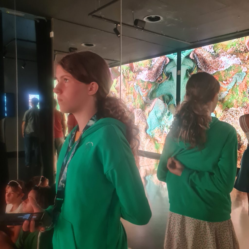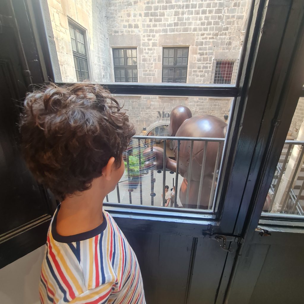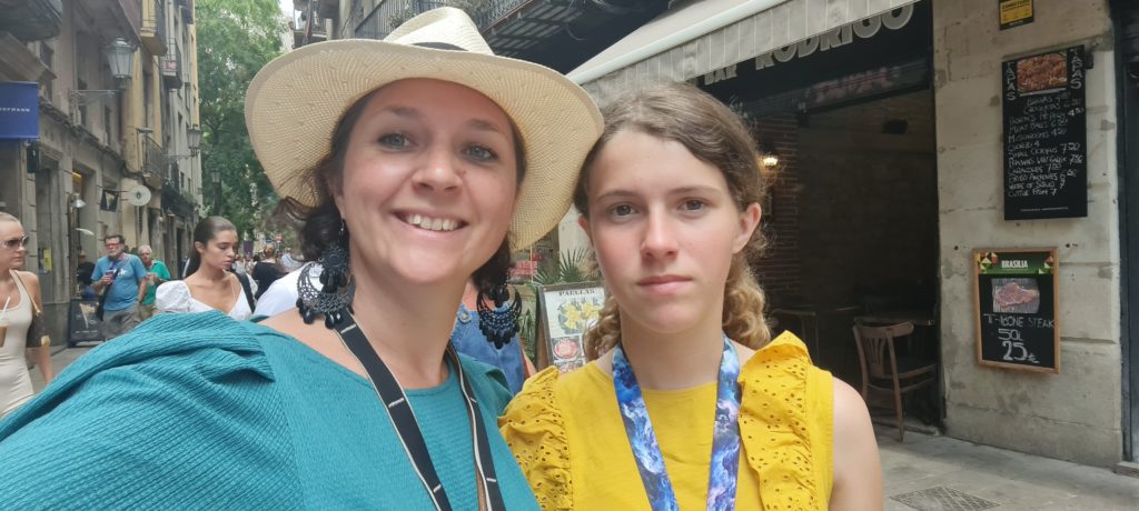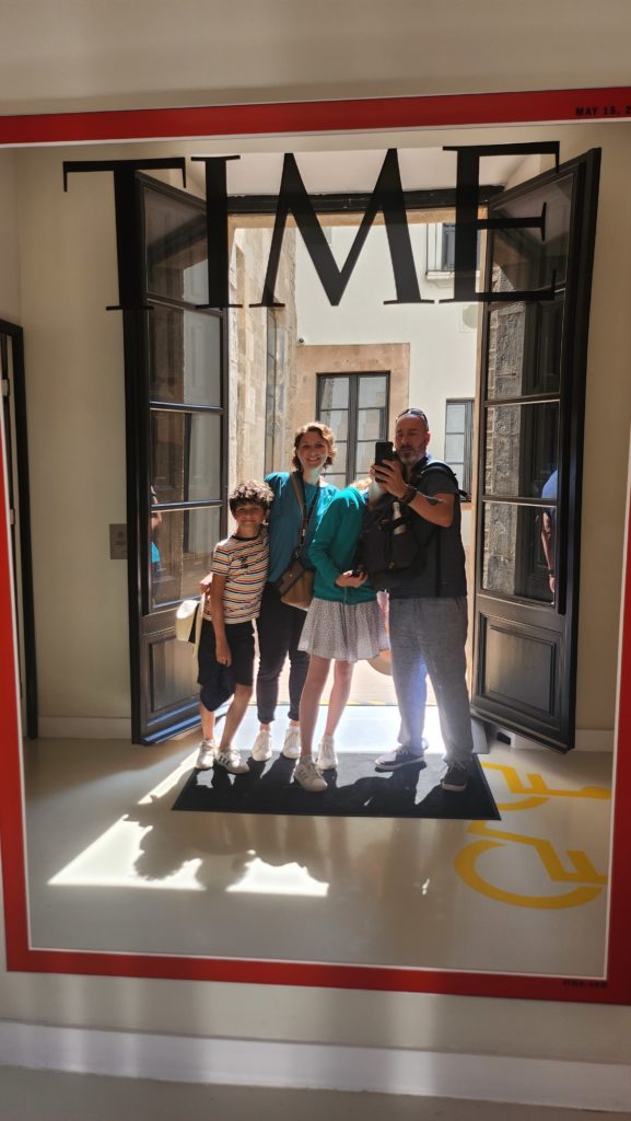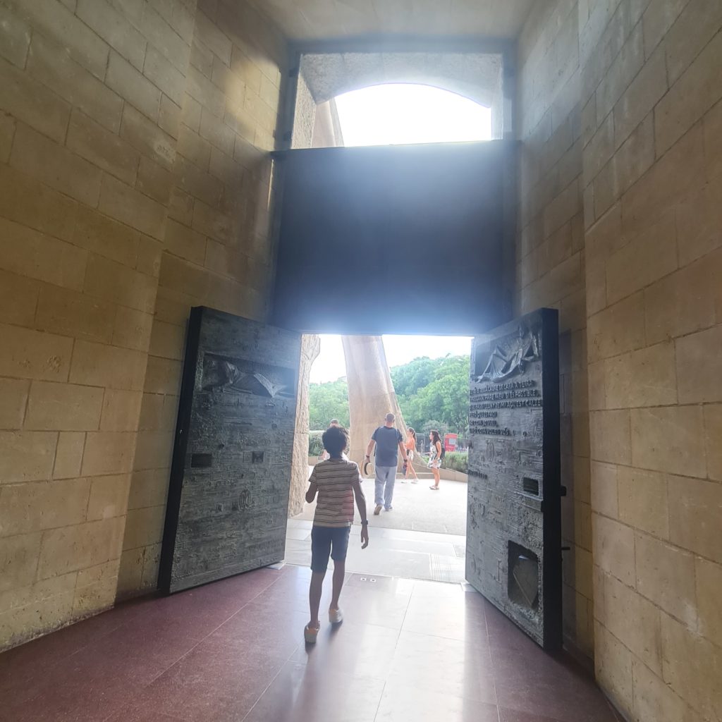 Arrivés sur le parvis, que c’est beau ! Les enfants tiennent à télécharger l’audio-guide pour connaître l’histoire de la Sagrada. Il y a une maquette de l’église une fois terminée, il ne manque plus grand-chose.