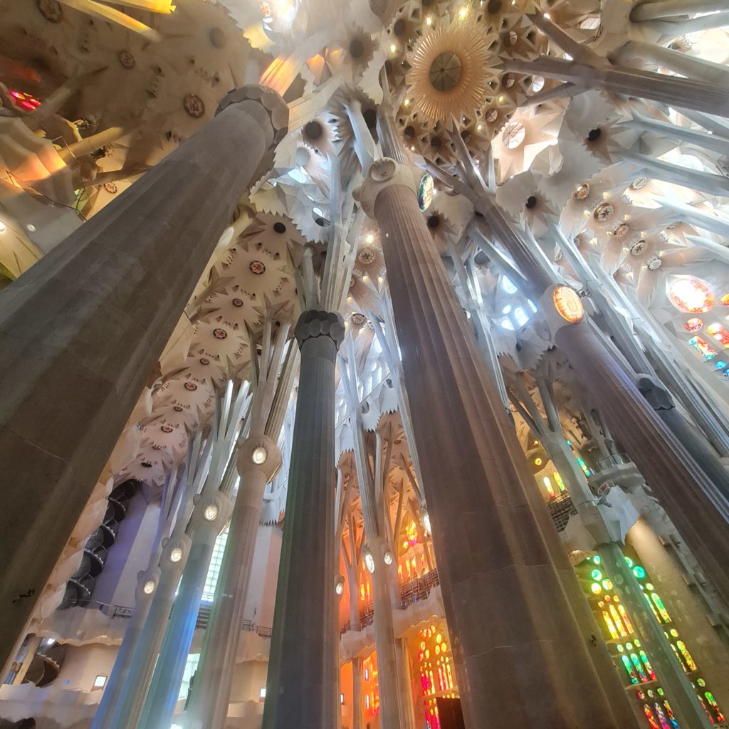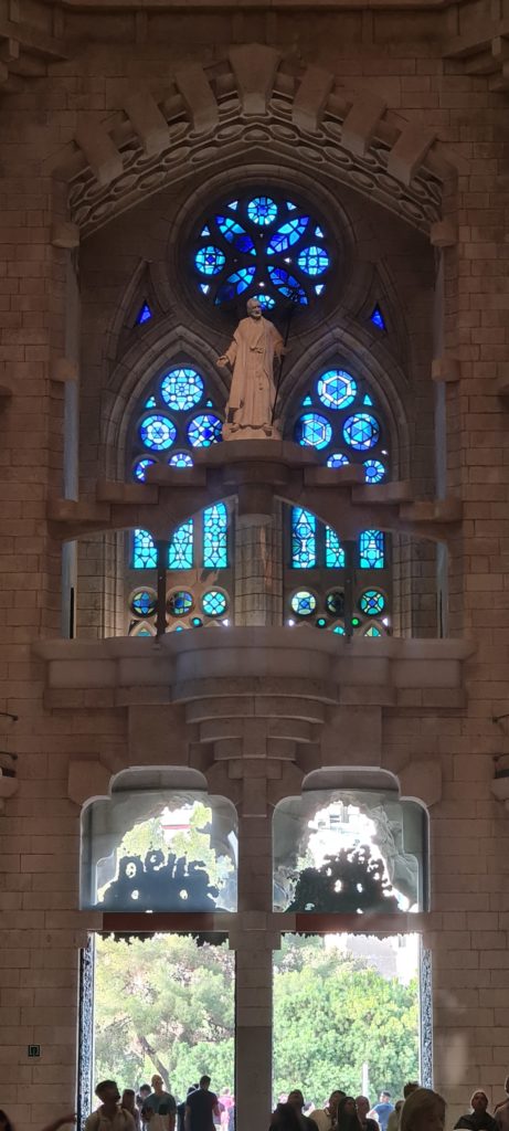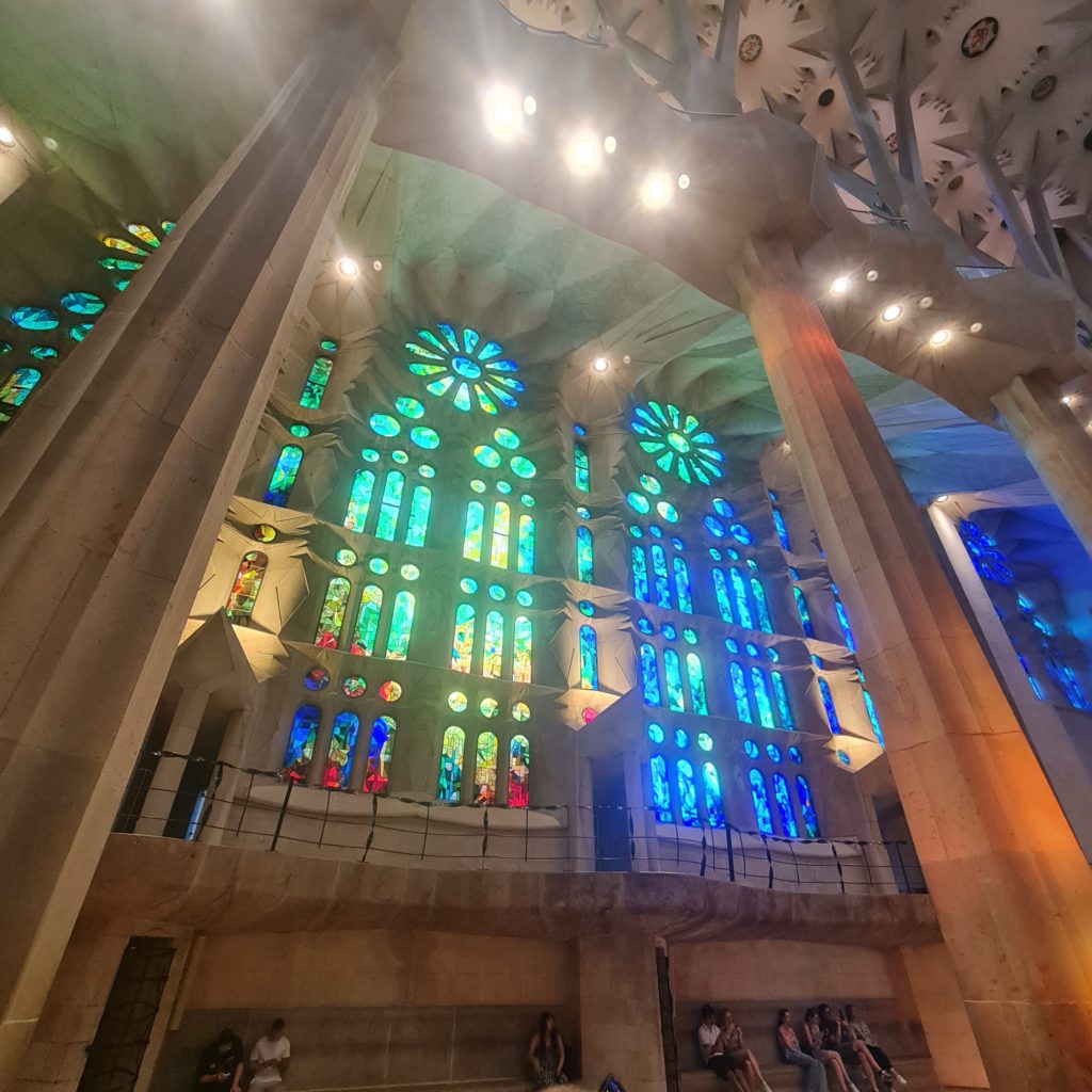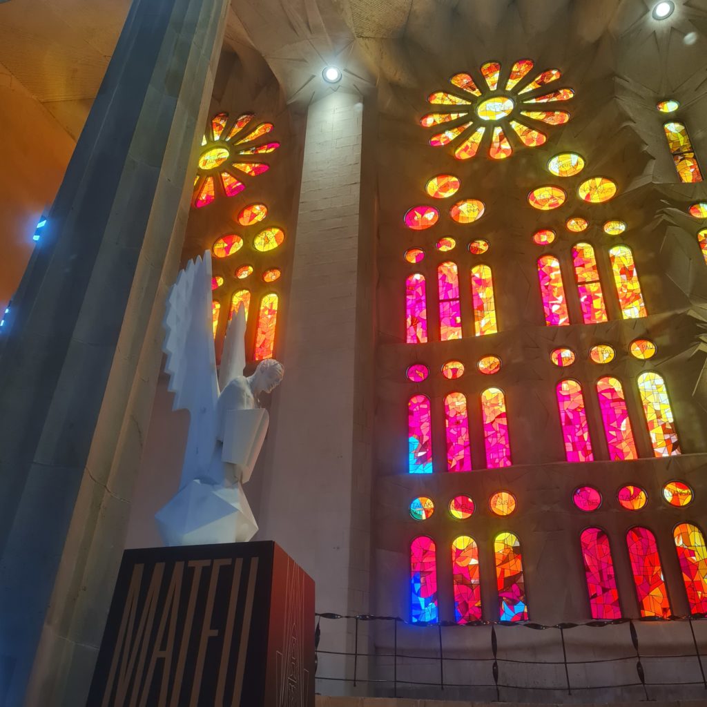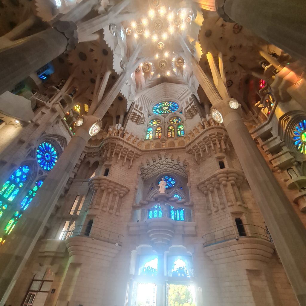À l’intérieur, ouahhhh, quel spectacle !! Une forêt de piliers blancs tels des arbres montant vers le ciel, des vitraux ultra colorés, que c’est beau ! Je n’avais pas souvenir d’un tel intérieur la dernière fois que nous étions venus à Barcelone il y a 15 ans, après notre mariage. Nous sommes enchantés et restons un long moment à écouter les explications du guide et à admirer l’ensemble. Nous allons dans le déambulatoire et apercevons par des vitres la crypte en contrebas, là où les messes ont lieu et là où Gaudi est enterré. Par respect pour les personnes venues là pour prier, nous ne descendons pas.