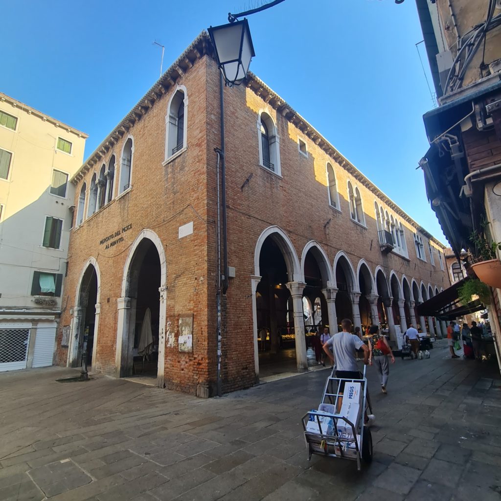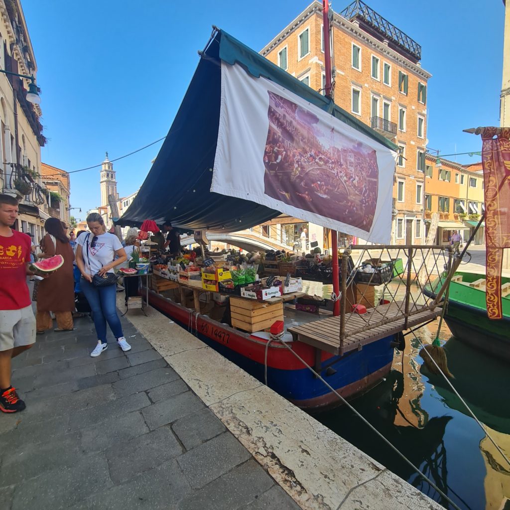 Nous avons prévu ce matin d’aller tôt au marché du Rialto mais tout le monde étant un peu fatigué, nous nous levons au dernier moment et partons vers 8h30 rejoindre les quais où se trouve le marché.