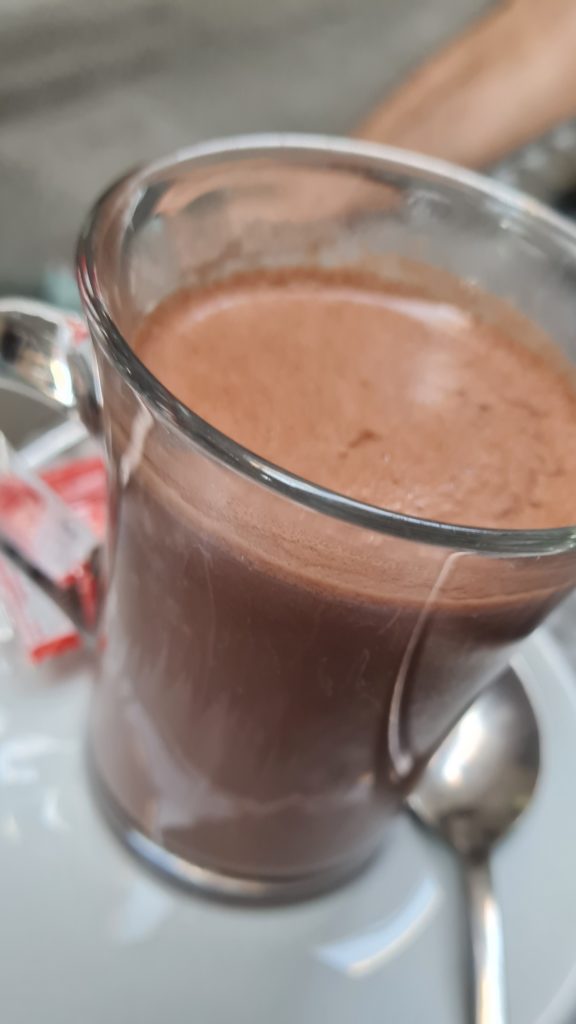 Nous trouvons un petit café avec du chocolat chaud blanc absolument délicieux et nous y prenons notre petit-déjeuner.