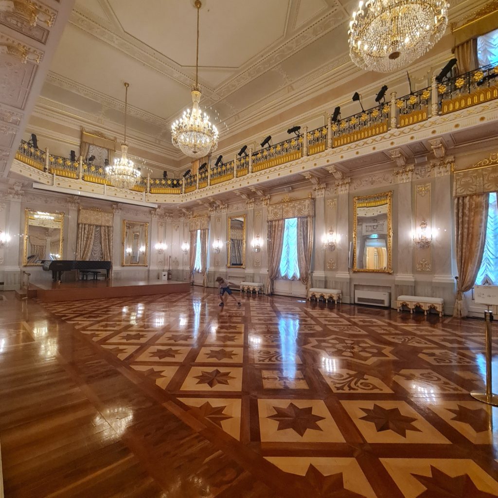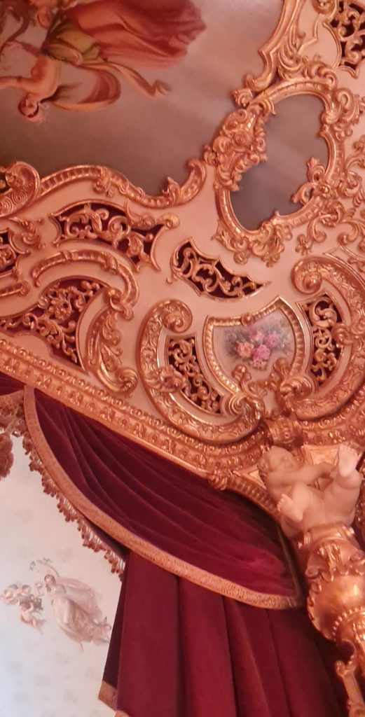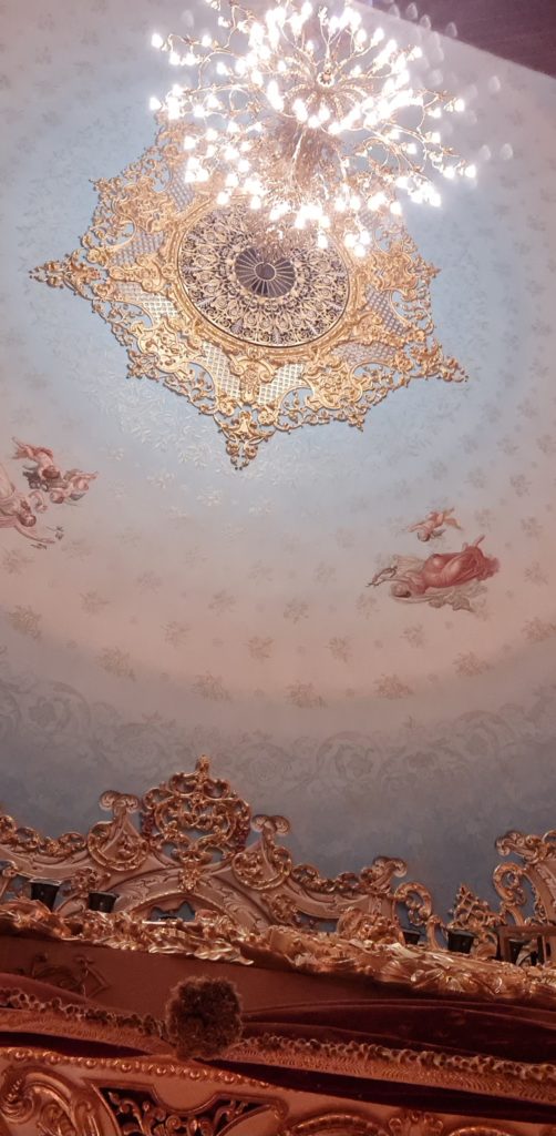 Ce théâtre est d’une grande beauté ! Nous parcourons l’entrée, le foyer, la salle de spectacle, les loges, la loge royale, la salle de bal, c’est splendide ! Les couleurs surtout sont d’une grande douceur et rendent le lieu très apaisant.