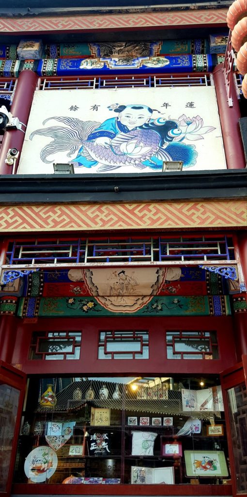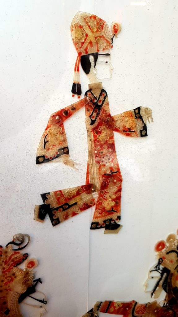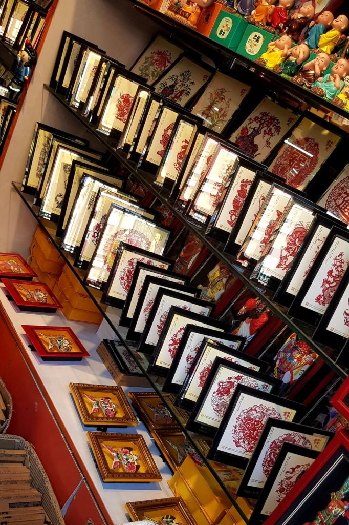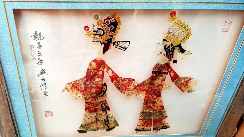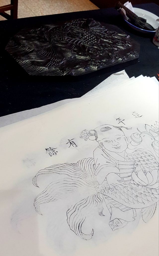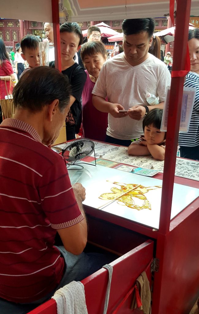 Nous verrons ainsi des instruments de musique traditionnels, des figurines en terre cuite, des sculptures de marbre, des éventails, des broderies de fils de soie, des bijoux en argent, des sculpteurs de noix, des tampons de marbre, des pinceaux pour la calligraphie traditionnelle, des plumeaux en plumes de coq, des marionnettes en peaux de cochons séchées et peintes pour le théâtre d’ombres et de la gravure sur bois avec impression manuelle. Je me suis d’ailleurs tirée une estampe moi-même !!