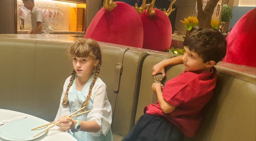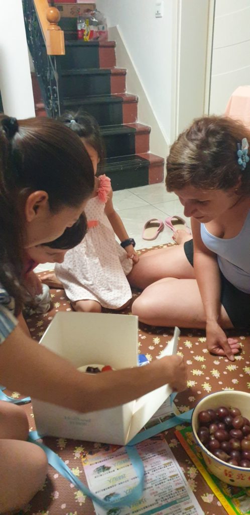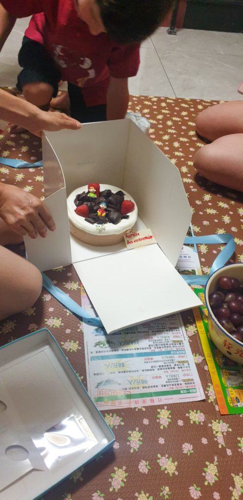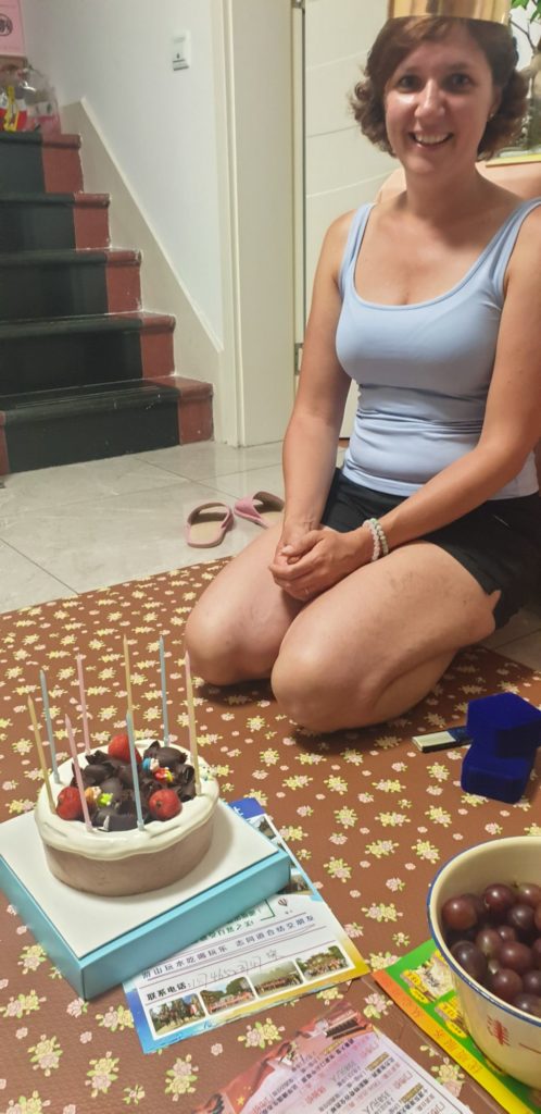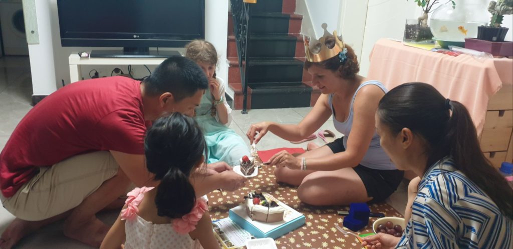 Installés sur un tapis au sol pour déguster le gâteau et des fruits découpés et préparés par Dong, ils me chantent « Joyeux anniversaire » en français et en chinois !!! Je suis très touchée par toutes ces attentions et très émue. Les enfants m’ont fait des dessins et préparé des chansons, mon chéri m’a trouvé pendant notre voyage 2 magnifiques paires de boucles d’oreilles.