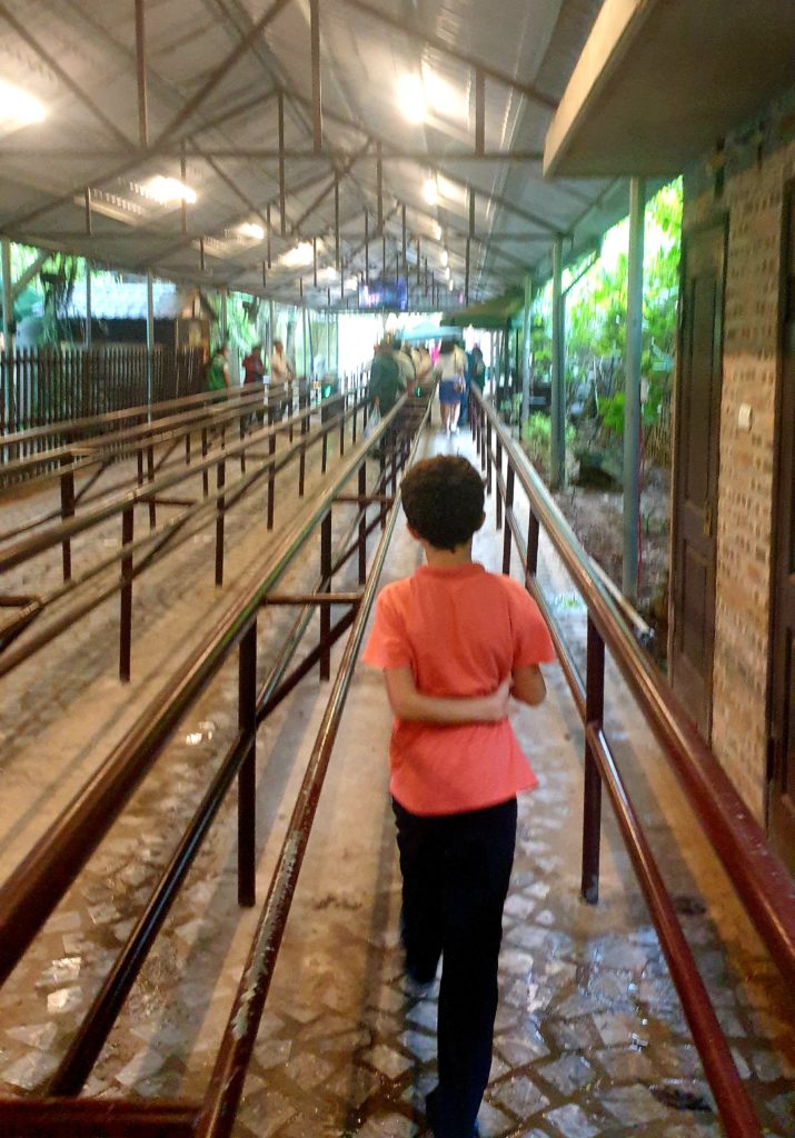 Sur le chemin du retour, nous empruntons un morceau de route prise à l’aller et là, on comprend pourquoi le routard nous avait conseillé de venir très tôt : des centaines de barques se suivent à la queue leu leu, dans un brouhaha insupportable, amplifié par l’écho des cirques. Quelle horreur ! Notre guide nous approuve en nous disant, en rigolant « oui, il faut venir très tôt ! »