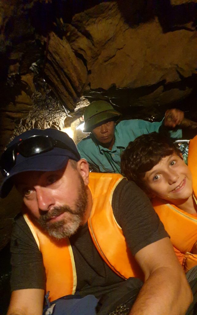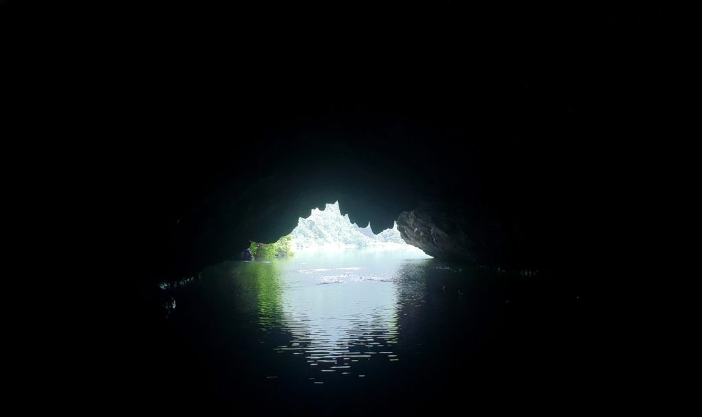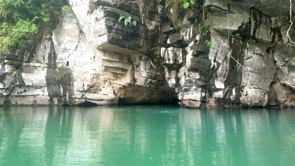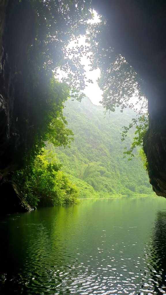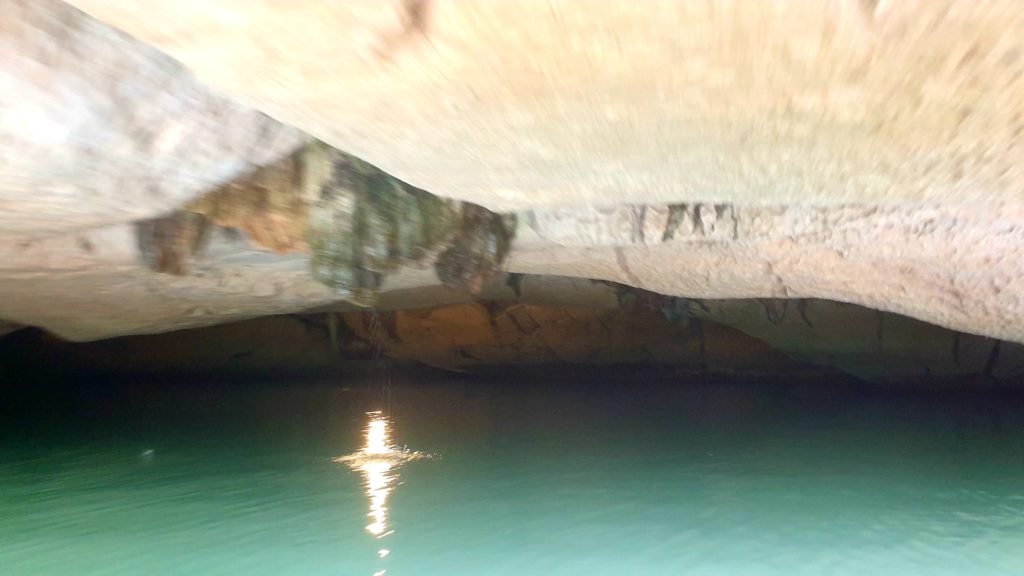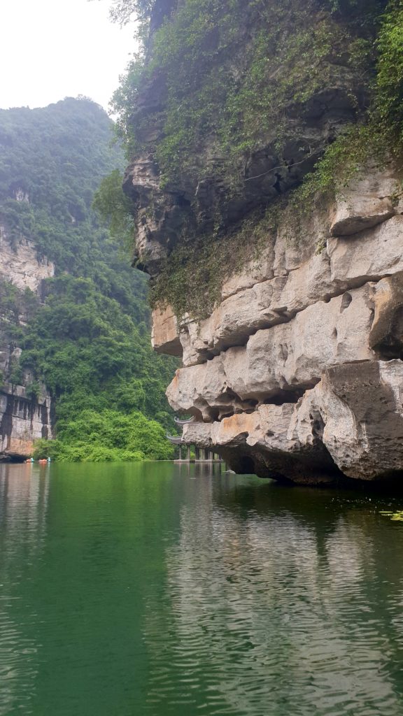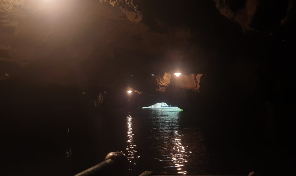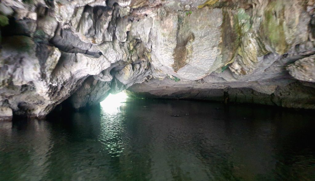 Nous traversons plusieurs grottes, en étant parfois obligés de nous accroupir au fond de la barque tellement le plafond est bas ! C’est impressionnant, le goutte à goutte de l’eau qui ruisselle sur les parois, cette eau claire, et au fond… la lumière puis un nouveau cirque et un nouveau paysage qui nous saisit à chaque fois ! C’est grandiose !