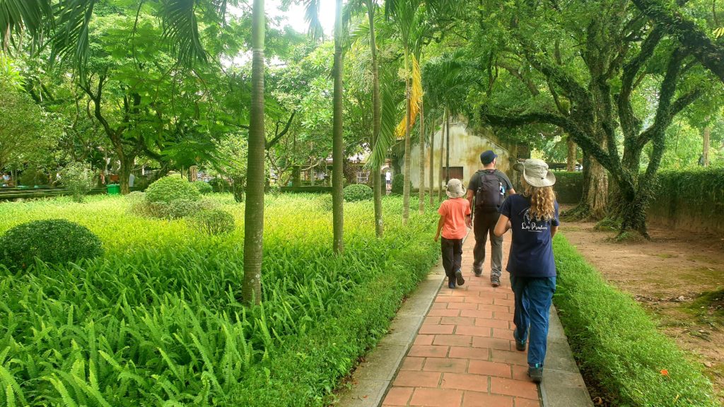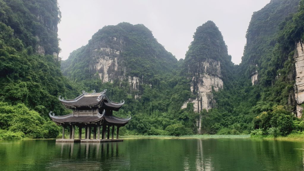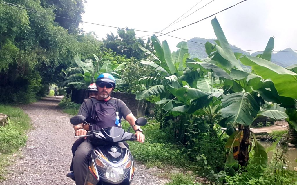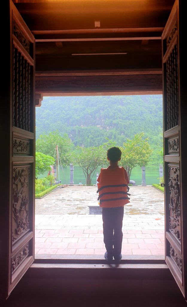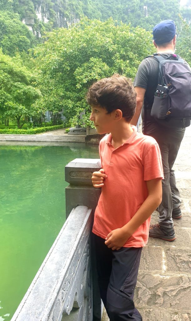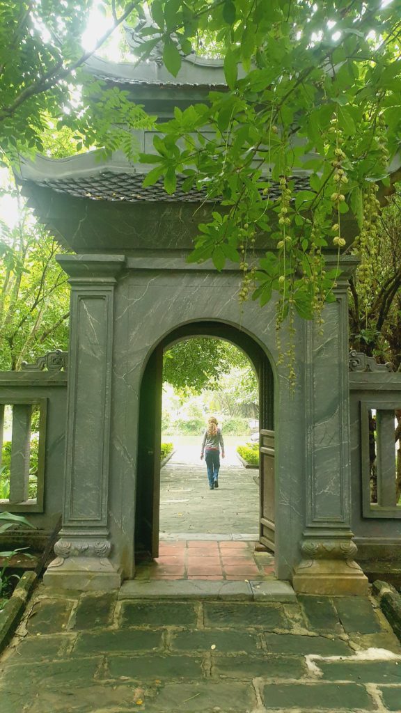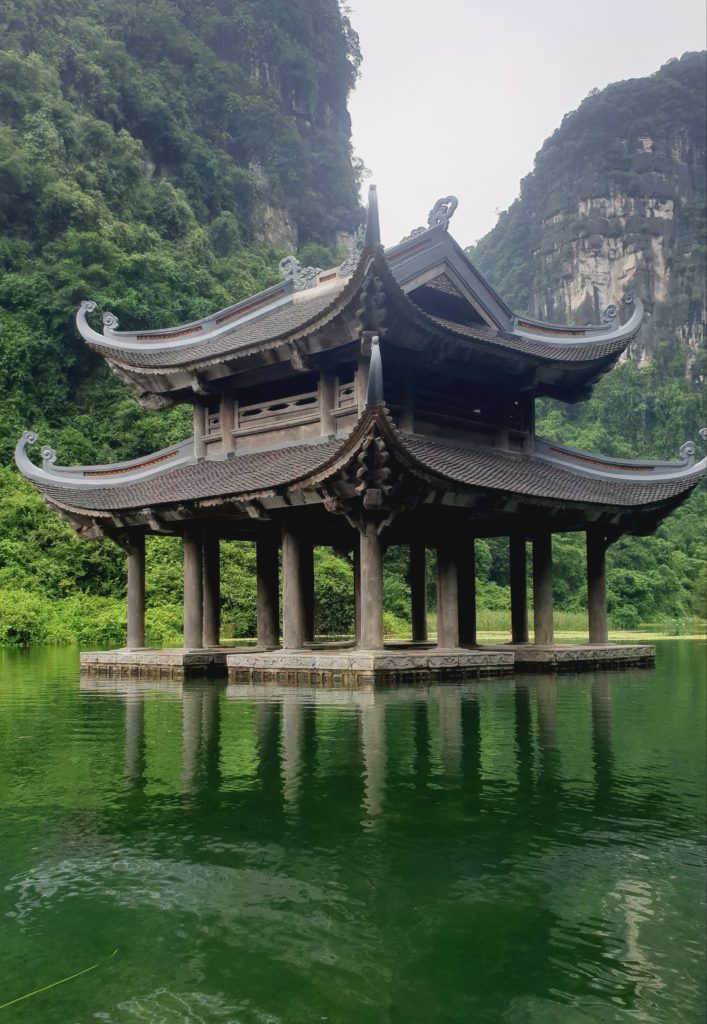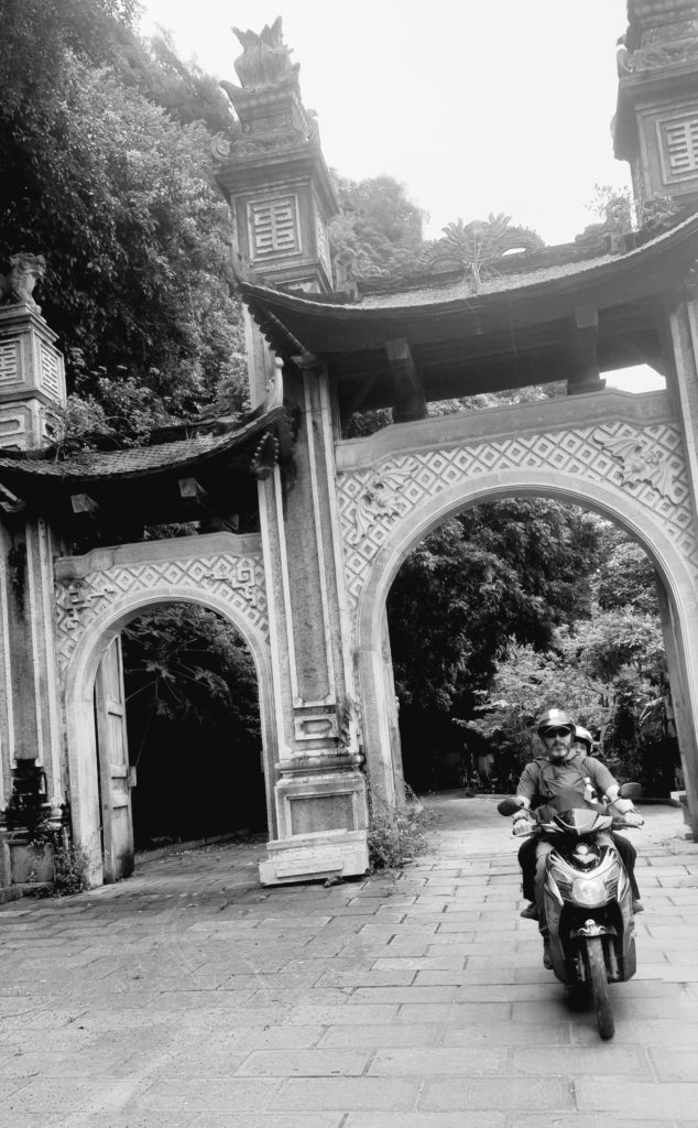Nous somme encore en scooter aujourd’hui. Nous poursuivons notre balade en direction de Hoa Lu, une très ancienne capitale, dont il ne reste que quelques bâtiments. Idéalement placée, ce très joli village est adorable : des toits recourbés, de l’eau, des vieux arbres, de la mousse, des oiseaux, les pains de sucre en toile de fond, tout est là.