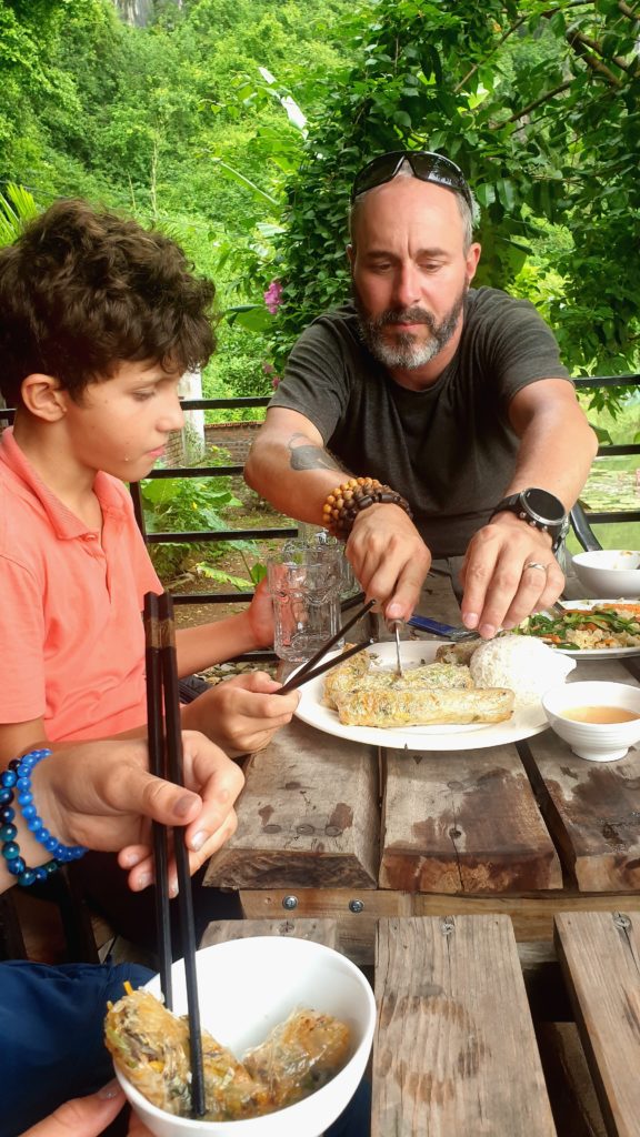 Nous grimpons les escaliers qui mènent au sommet d’une des montagnes pour admirer la vue d’en haut (trop de marches, c’était horrible) puis nous déjeunons face aux rizières, dans un petit resto où se retrouvent plein de français !