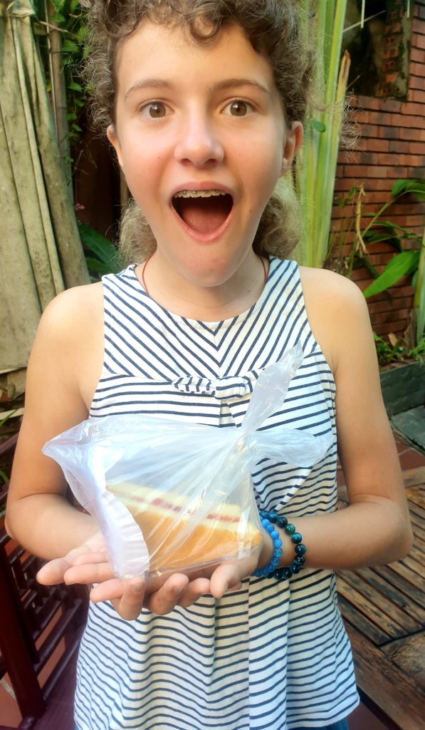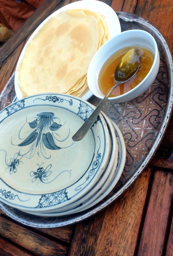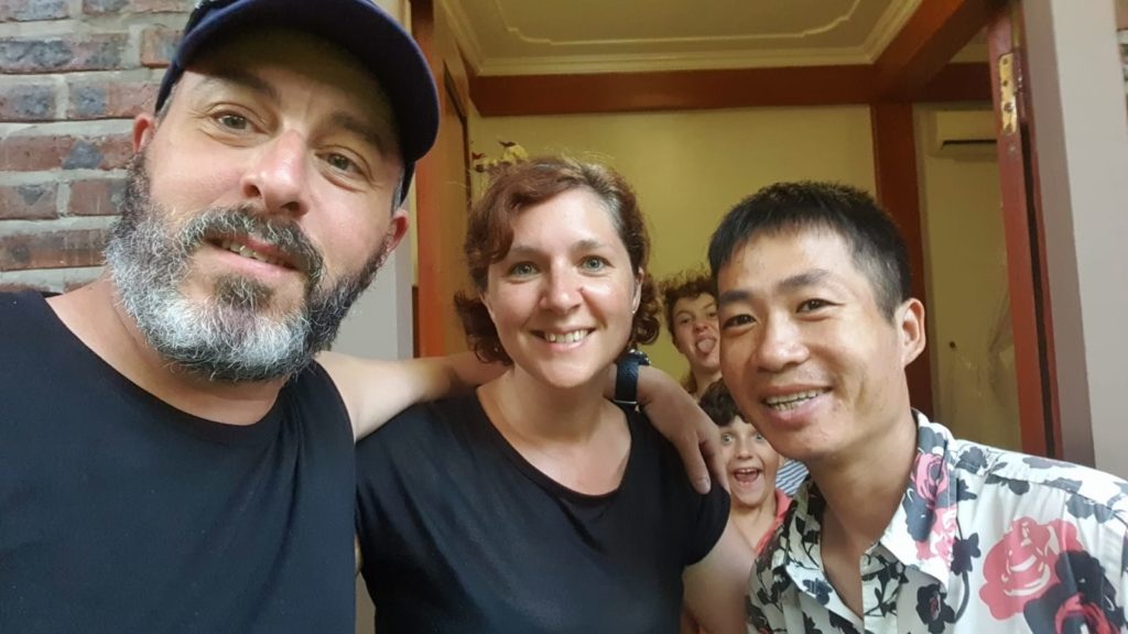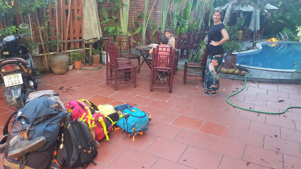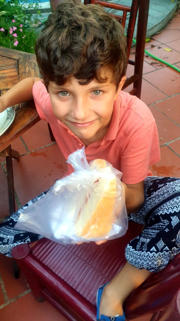Toan nous attend avec des crêpes et du miel qu’il a faites spécialement ce matin pour nous. Il s’excuse car il doit nous laisser pour aller chercher ses enfants pour les emmener à l’école. 5 min après il est de retour en courant car il a acheté des gâteaux pour nos enfants. Que c’est gentil ! Avant de partir, mamie vient nous dire au revoir et vérifier nos sacs.