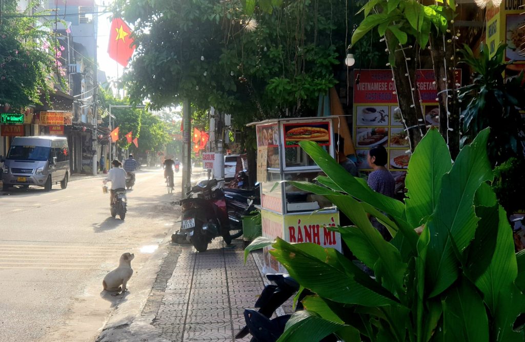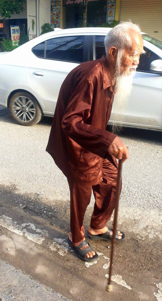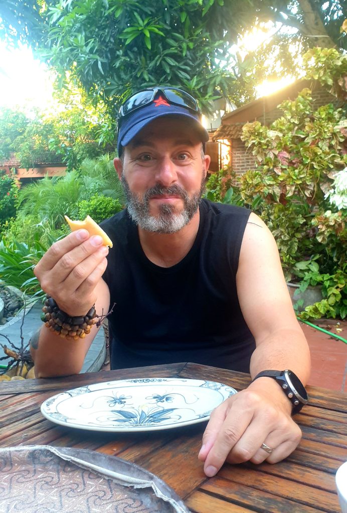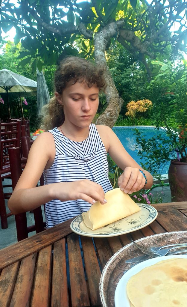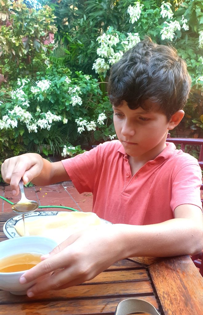 Toan nous attend avec des crêpes et du miel qu’il a faites spécialement ce matin pour nous. Il s’excuse car il doit nous laisser pour aller chercher ses enfants pour les emmener à l’école. 5 min après il est de retour en courant car il a acheté des gâteaux pour nos enfants. Que c’est gentil ! Avant de partir, mamie vient nous dire au revoir et vérifier nos sacs.