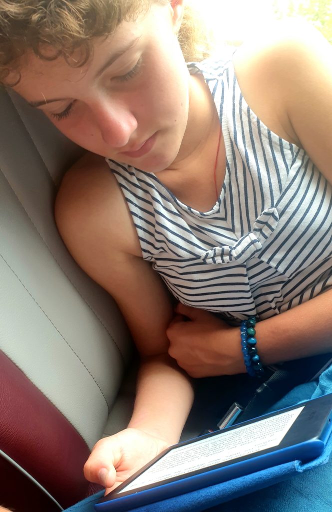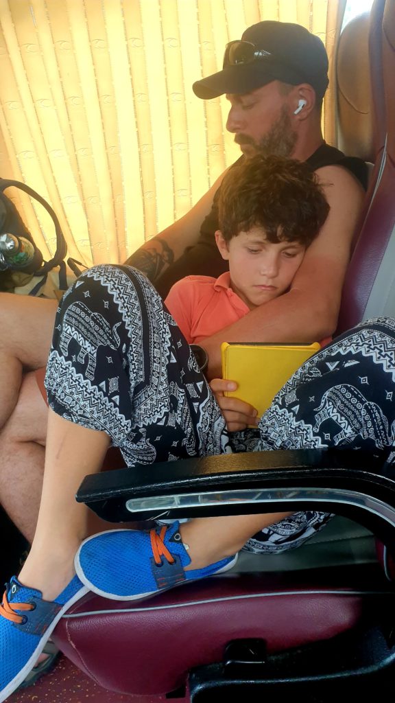 À un moment, notre bus s’arrête au bord de la route, notre chauffeur nous fait signe de descendre. Nous sautons à toute vitesse pour récupérer nos sacs. Une belle voiture nous attend, le chauffeur nous explique que pour que nous soyons à l’heure, nous allons être conduits directement au bureau de la compagnie de bateaux avec ce nouveau véhicule. Ohhhh !…