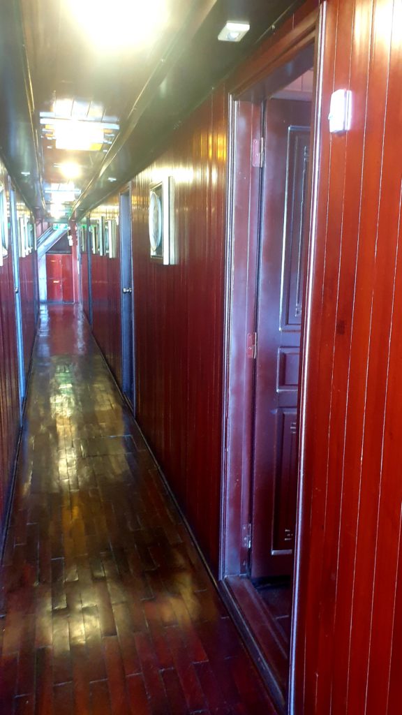 Nous embarquons sur un super joli navire avec pont en bois et cabines anciennes. Les enfants ont la leur, et nous la nôtre.