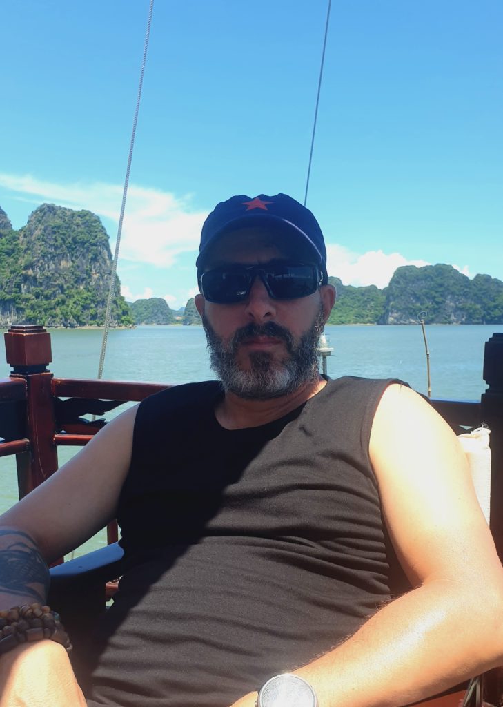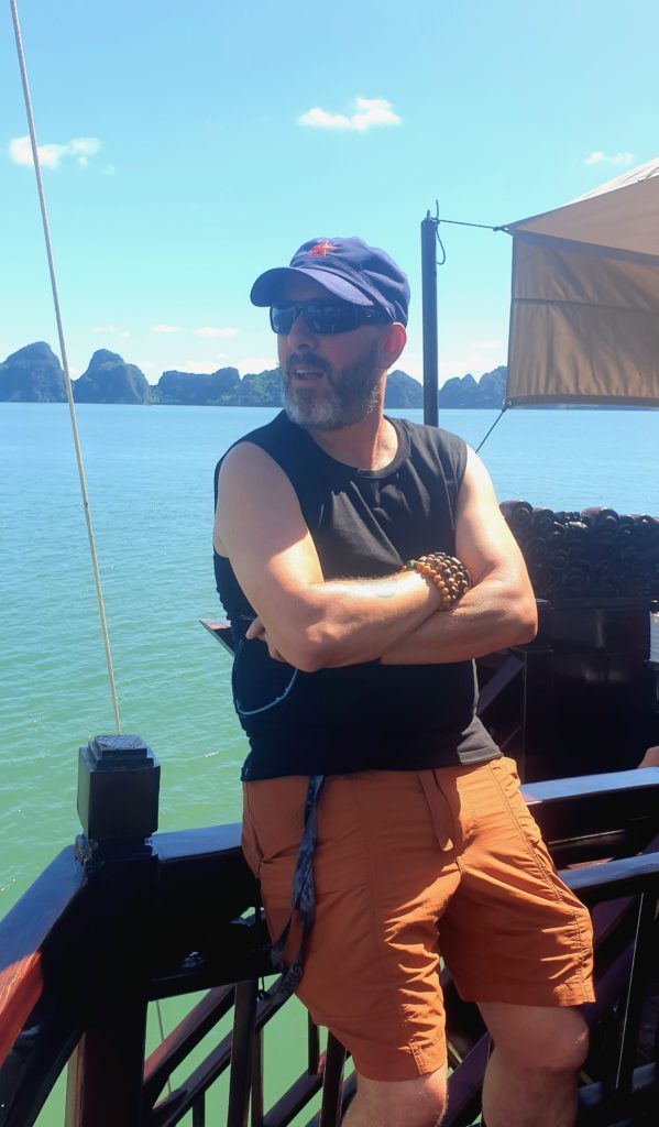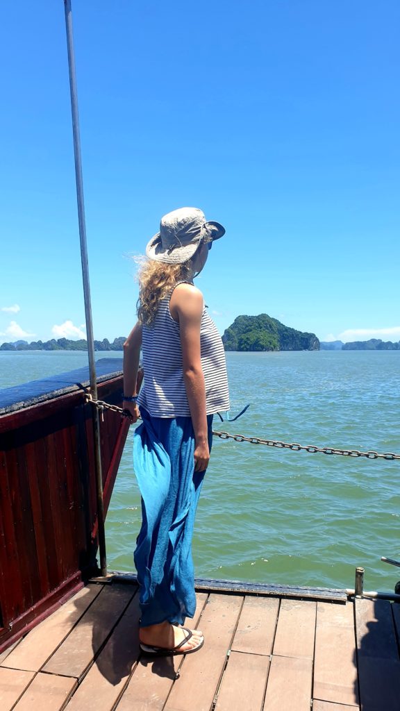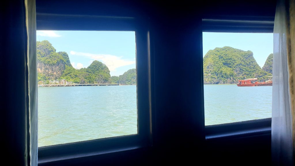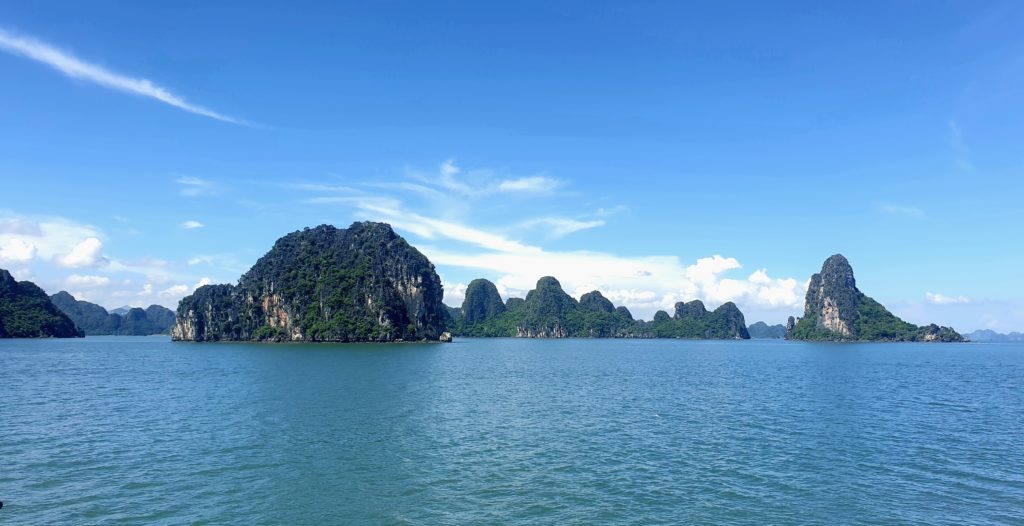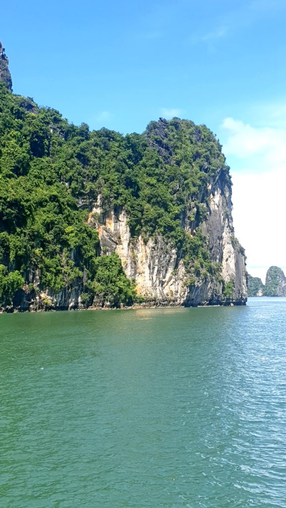 Nous déjeunons sur le pont, le repas est délicieux, le bateau s’éloigne des côtes pour s’enfoncer dans la baie, au milieu des pitons rocheux.