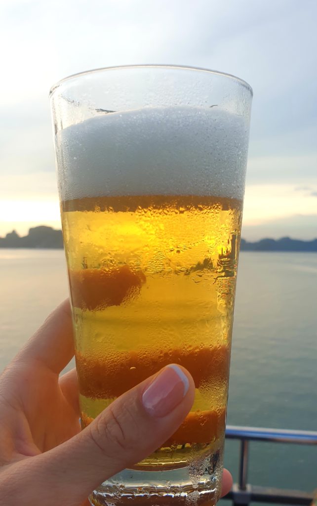 Dès que le bateau se met en route, et que nous sommes installés, on nous offre un verre à boire pendant un petit debrief puis nous passons à table.