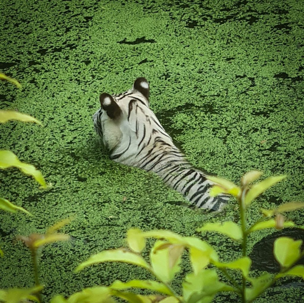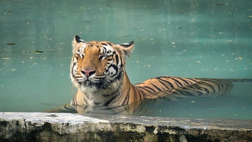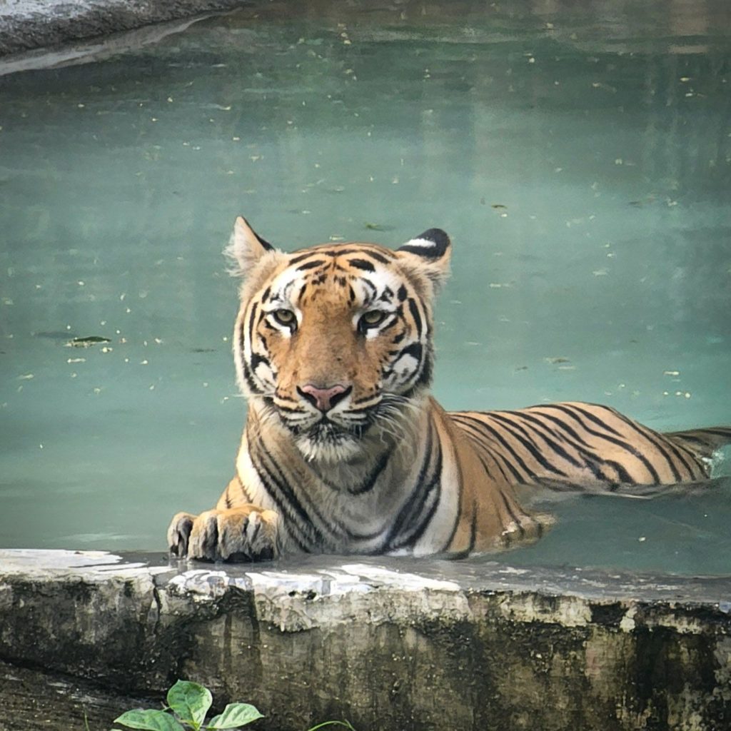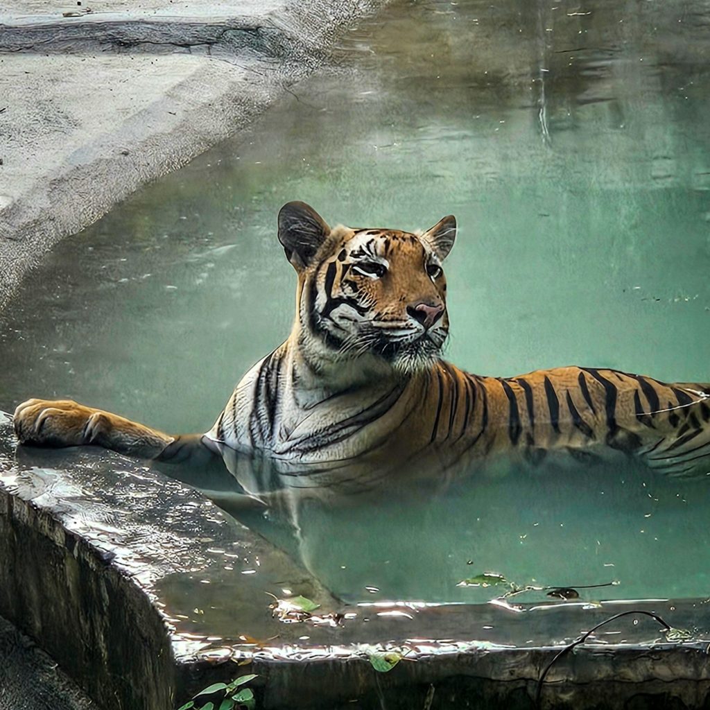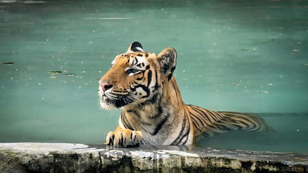 Les singes volent les glaces aux visiteurs !Ils attendent près de la boutique qui les vend, et sautent sur les passants !Le vendeur de glaces a un énorme lance-pierre dans la main si les singes s’approchent de sa boutiqueCette éléphante est très agitée, on dirait qu’elle attend quelque chose…Dans ce zoo, on suppose qu’il y a quelques années, les visiteurs pouvaient faire une balade à dos d’éléphant. Leurs soigneurs-dresseurs restent avec eux, dans leur propre cahute.Les éléphants répondent à la voix de leur soigneur !Il y en a un 2ème qui attend son tour derrière…Les tigres ont chaud, ils restent dans l’eau !