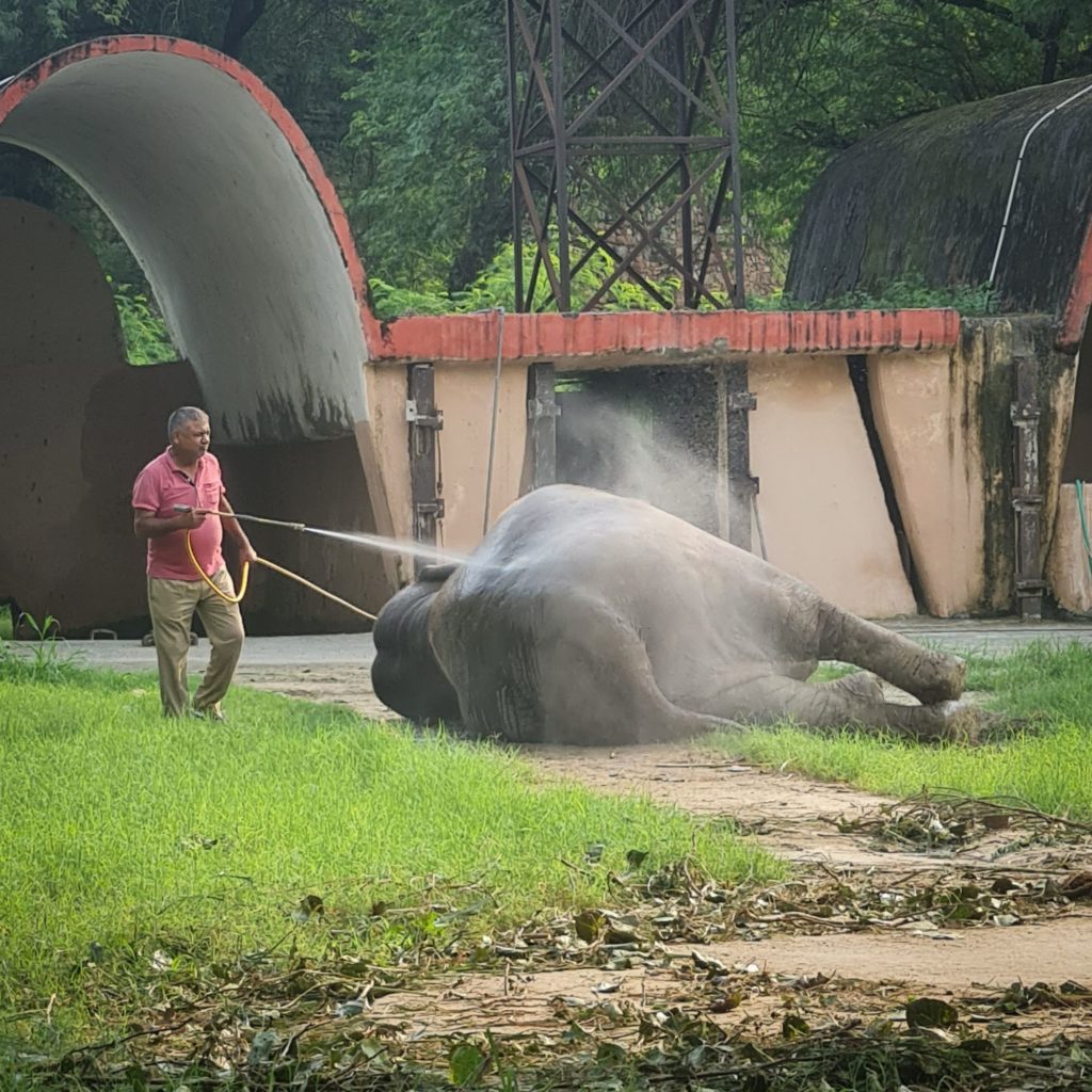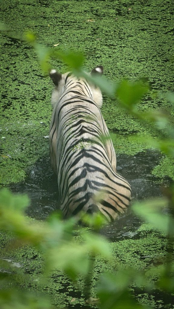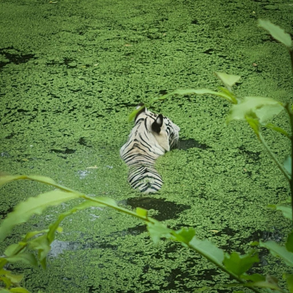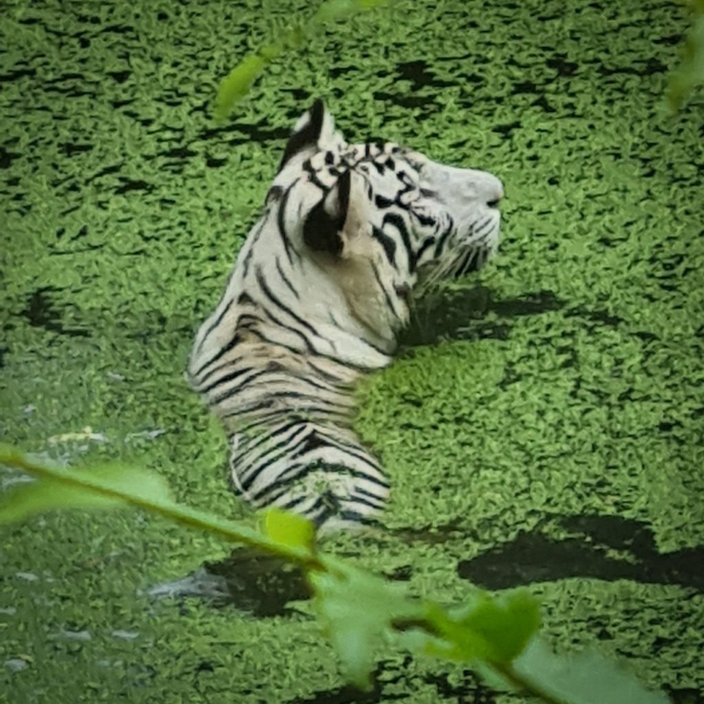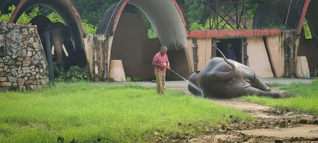 Les singes volent les glaces aux visiteurs !Ils attendent près de la boutique qui les vend, et sautent sur les passants !Le vendeur de glaces a un énorme lance-pierre dans la main si les singes s’approchent de sa boutiqueCette éléphante est très agitée, on dirait qu’elle attend quelque chose…Dans ce zoo, on suppose qu’il y a quelques années, les visiteurs pouvaient faire une balade à dos d’éléphant. Leurs soigneurs-dresseurs restent avec eux, dans leur propre cahute.Les éléphants répondent à la voix de leur soigneur !Il y en a un 2ème qui attend son tour derrière…Les tigres ont chaud, ils restent dans l’eau !