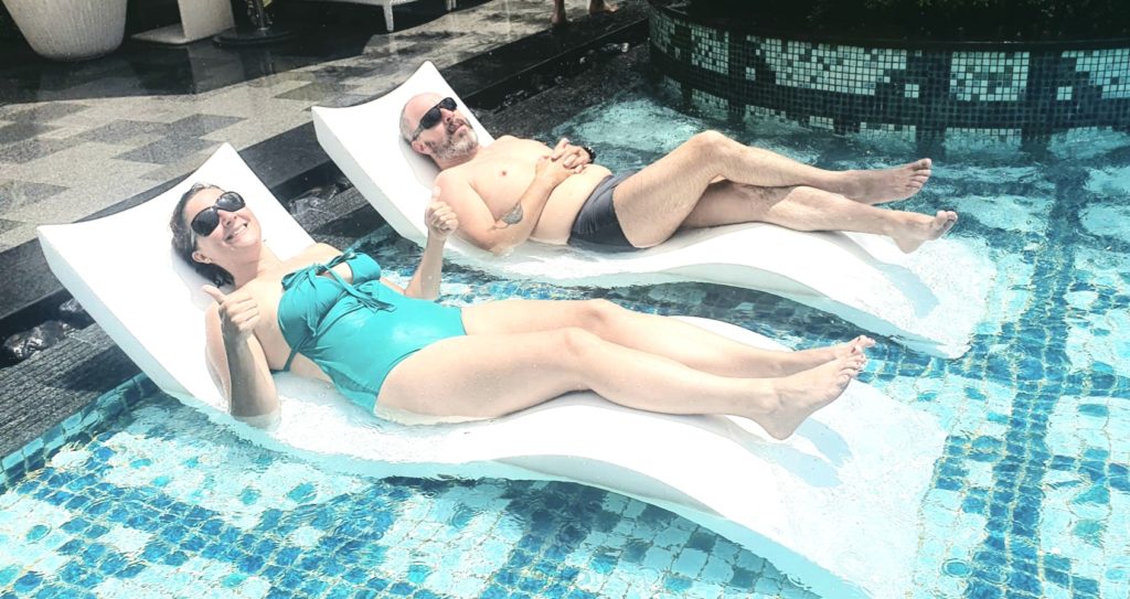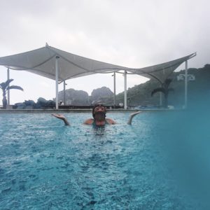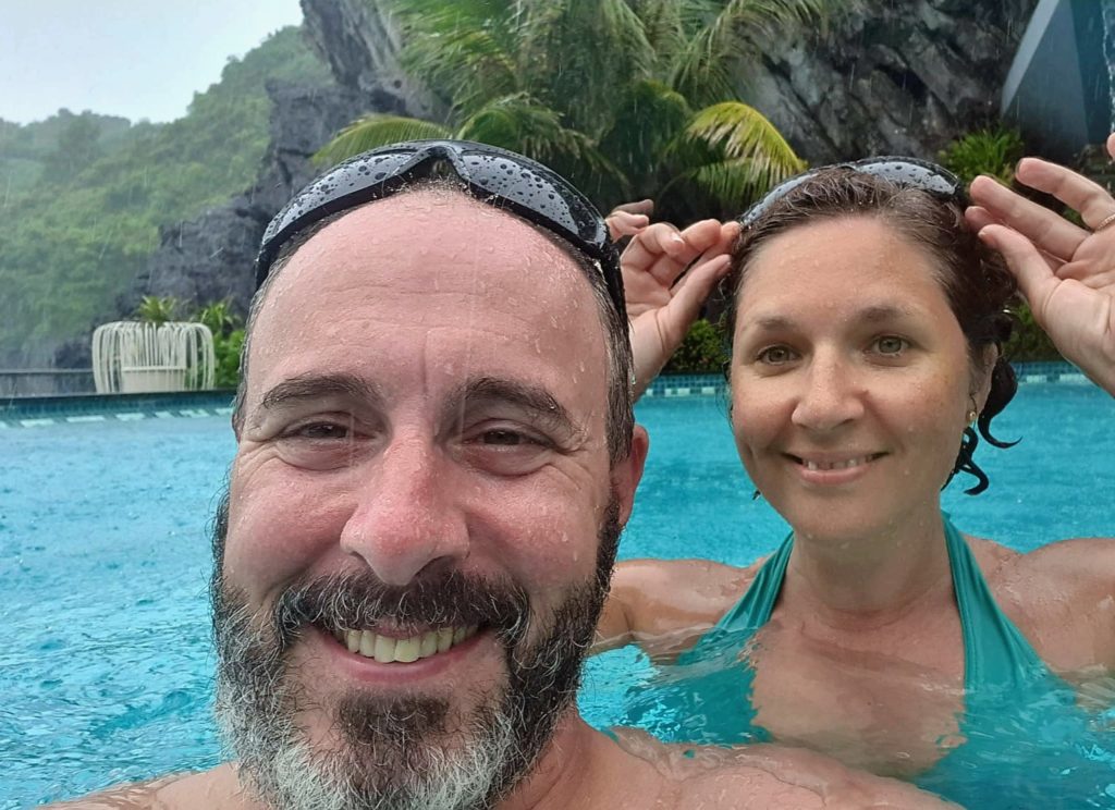 Pour notre dernière journée ici, nous profitons du soleil, de la piscine, malgré un énorme grain qui est passé pendant quelques minutes au-dessus de l’île.