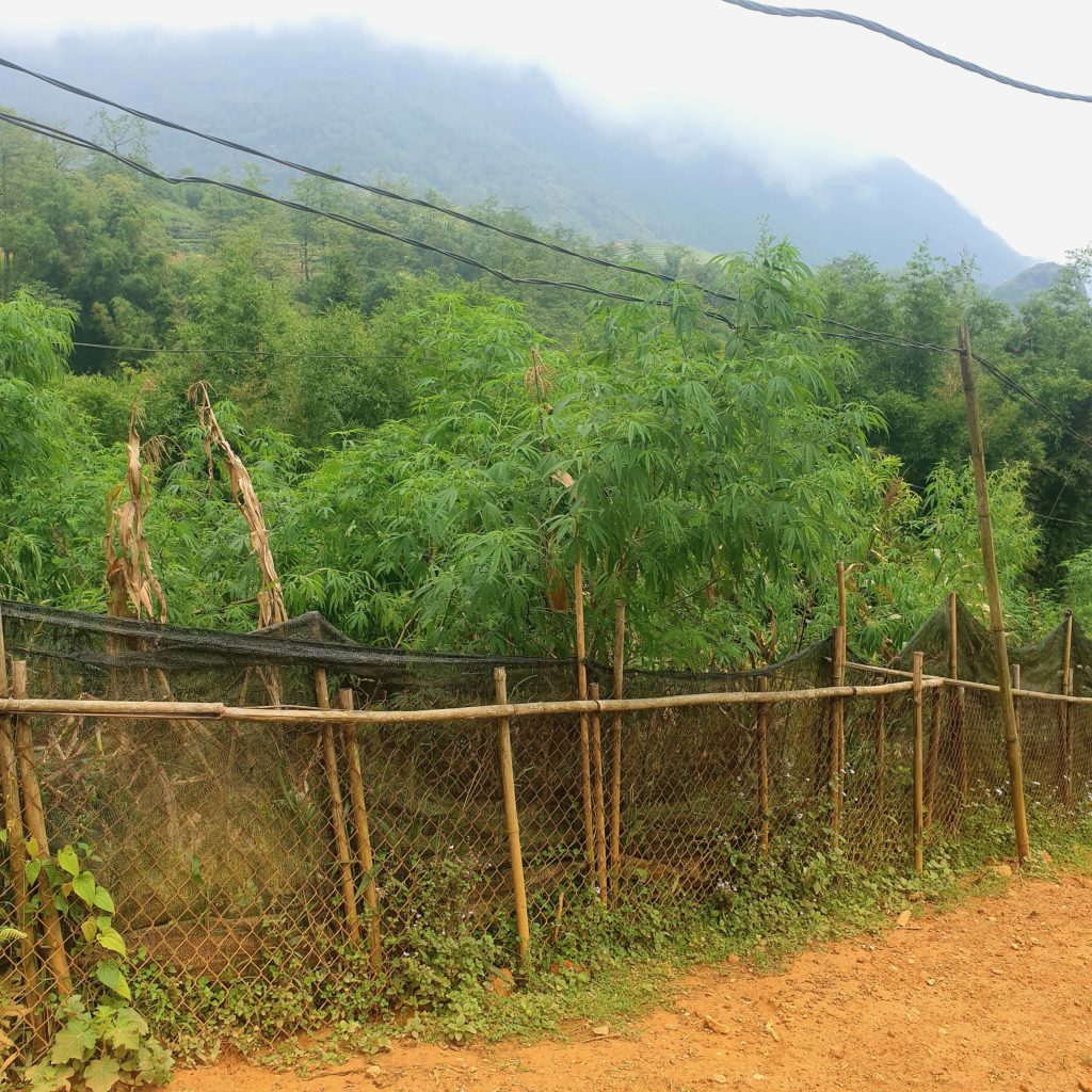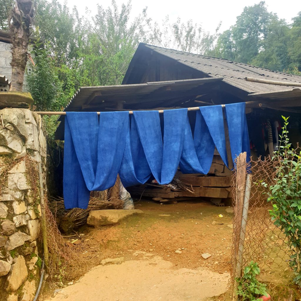 Des bottes de fils sont suspendus un peu partout. Je demande à Su ce que c’est : ici, dans les montagnes, les Hmong cultivent la marijuana (le chanvre) pour fabriquer des tissus magnifiques. Elle m’explique que tout est fait à la main : la tige est cassée pour être pelée, puis les « pelures » sont affinées, peignées, filées et tissées. Ici, ils cultivent également la plante qui sert à faire la couleur indigo, donc chaque famille tisse le chanvre et fait ses propres teintures. Devant chaque maison, on voit des tentures en train de sécher avec des variations d’indigo. C’est magnifique !