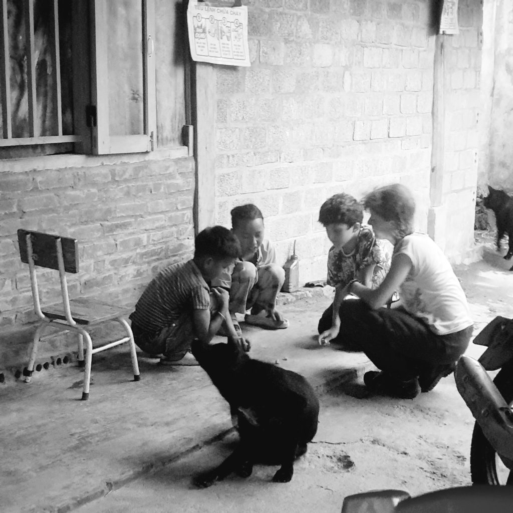 Poules, poussins, canards et canetons vivent derrière la maison, les enfants sont super contents de pouvoir les observer tranquillement. Mais très vite, le courant passe avec les 2 autres enfants qui leur montrent leurs jeux : ici, ce sont les osselets (comme au Cambodge) avec des petits cailloux et surtout, une partie de cache-cache qui va durer toute la soirée ! Ils s’éclatent !
