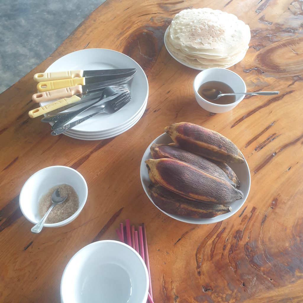 Encore des crêpes au petit-déjeuner, mais avec Éric, on prend du riz car on a besoin de sucres lents.