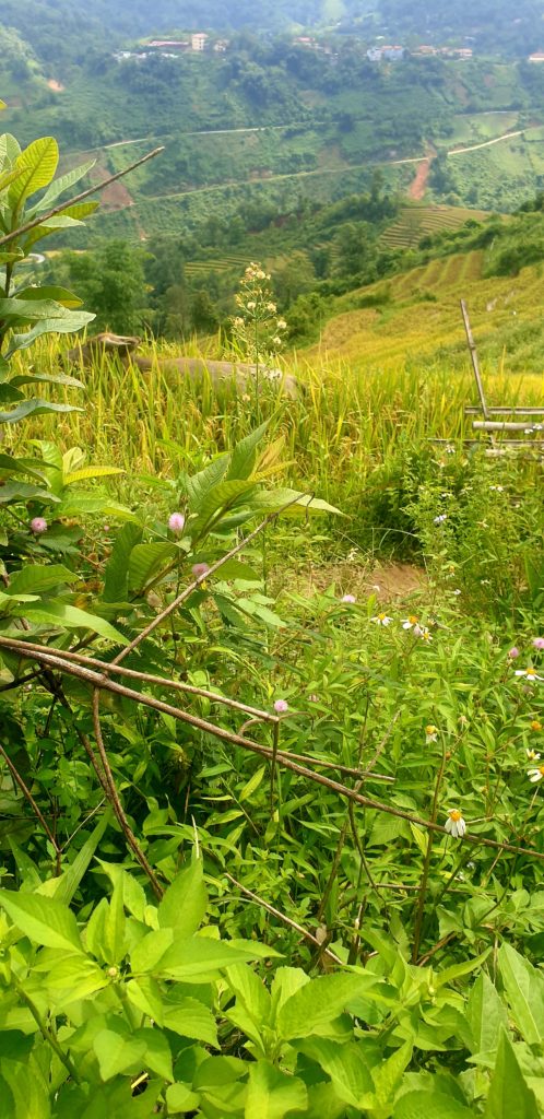 Dans une rizière, on se retrouve soudain sur le même chemin qu’un troupeau de buffles. Leur propriétaire, assez âgé, nous crie de nous pousser. On se dépêche de monter sur un talus, très en hauteur et on se retourne pour que les animaux ne croisent pas nos regards… Le monsieur a l’air stressé, du coup, les bêtes le sont aussi. Et ce qui devait arriver, arriva. Au moment où les buffles passent en-dessous de nous, le 1er prend peur et s’échappe dans la rizière en contrebas. Sacha sursaute et fait un bond lui aussi, vers Su, ce qui fait fuir le reste du troupeau. Le monsieur se met à hurler ; Il dit que ses bêtes ont abîmé une rizière et qu’il faut payer pour réparer les dégâts occasionnés. Su part discuter avec lui. En fait, le monsieur s’excuse d’avoir fait peur à Sacha, mais il est inquiet car cette rizière n’est pas à lui et il ne veut pas d’ennuis. Su lui donne un peu d’argent pour le dédommager, il s’excuse encore, mais il est rassuré.