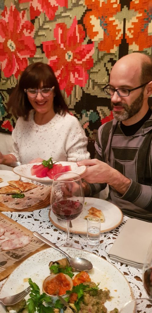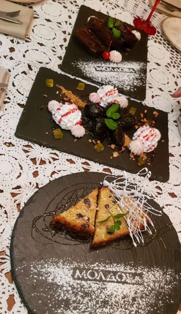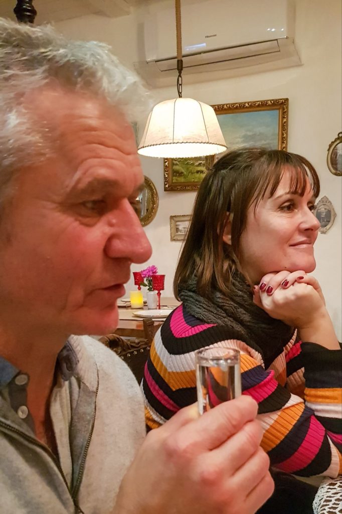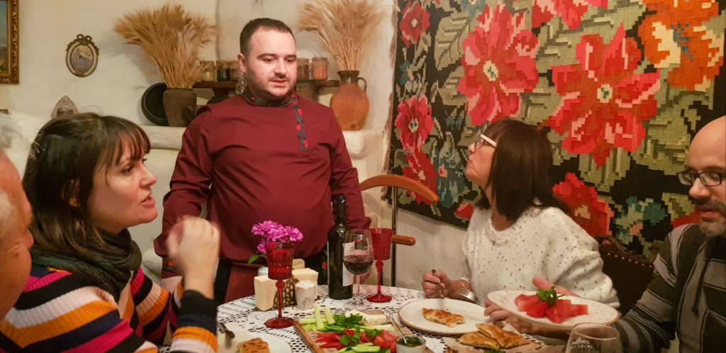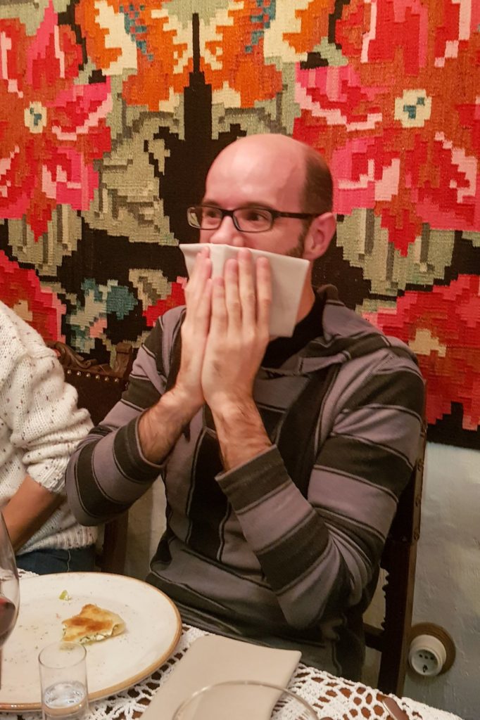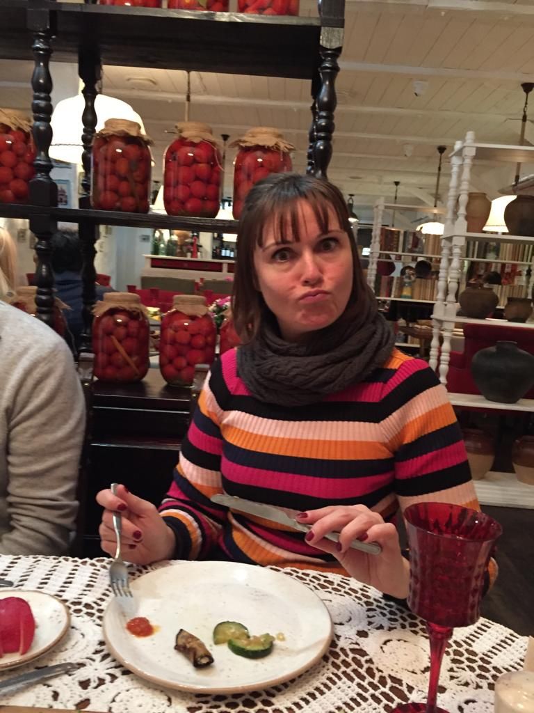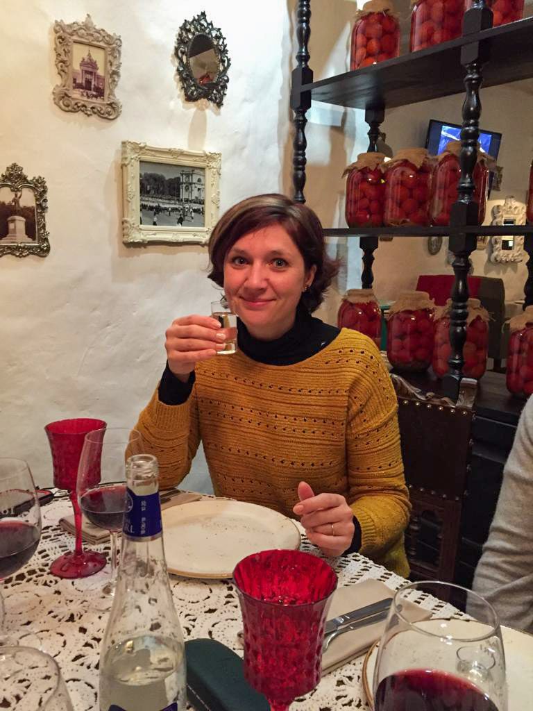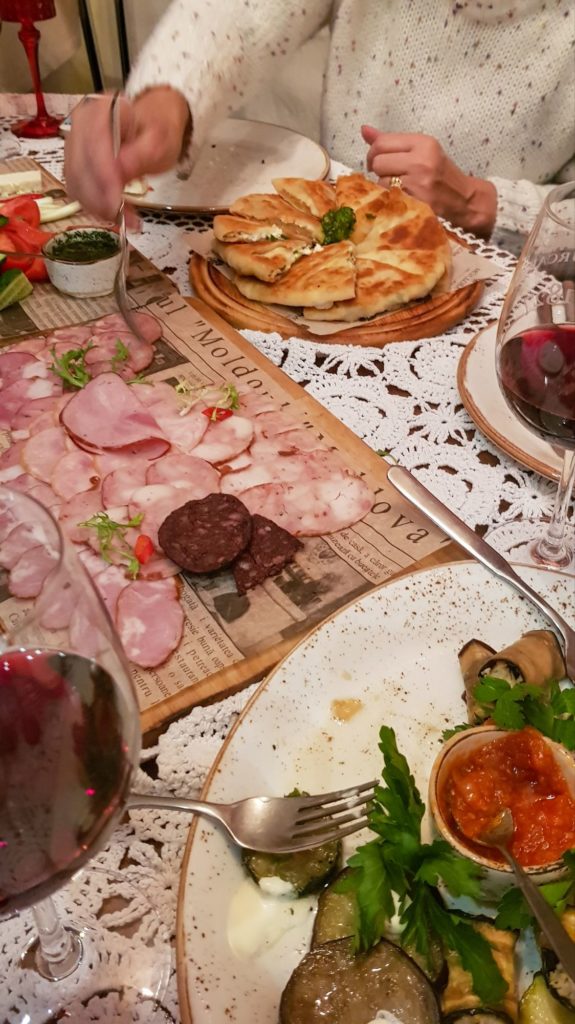 Nous nous installons à une table recouverte d’une magnifique nappe en crochet… Le serveur est super sympa et nous le laissons commander pour nous. Nous goûtons donc toutes les spécialités moldaves (dont un piment dont Stéphane se souviendra longtemps !) arrosées à la vodka !