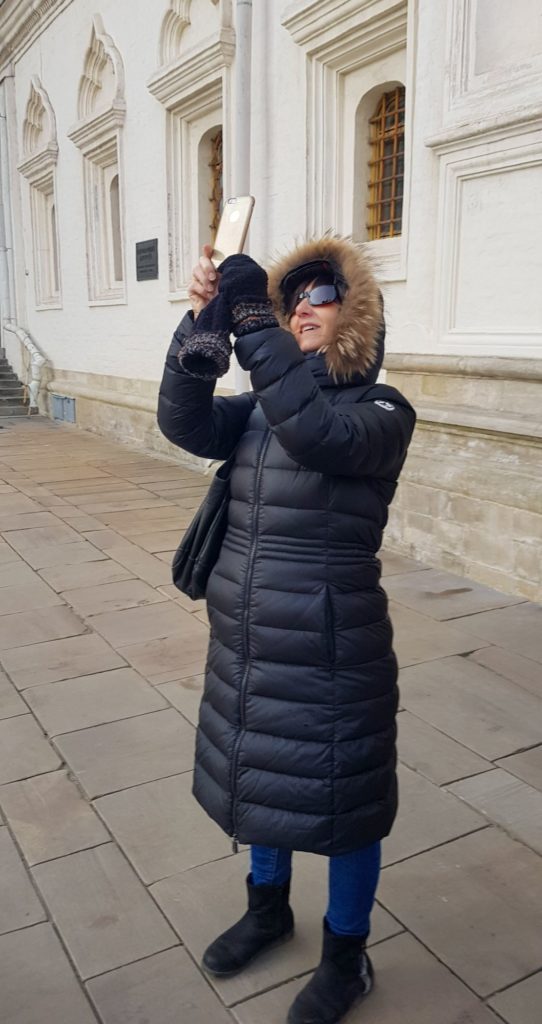 Au chœur de la cathédrale, devant une chapelle fermée au public, un pope est en train de commencer une messe et s’adresse aux fidèles. Pas de chaises ici, tout le monde reste debout. Les gens entourent et s’appuient contre une barrière qui ferme l’accès au centre de la cathédrale, là où le pope prêche. Cet espace ne sera ouvert aux fidèles qu’au moment de la bénédiction, un rituel très différent de celui auquel on peut assister en France (position des bras, etc…) Les femmes russes portent un foulard posé à l’arrière de la tête…je les trouve très belles.