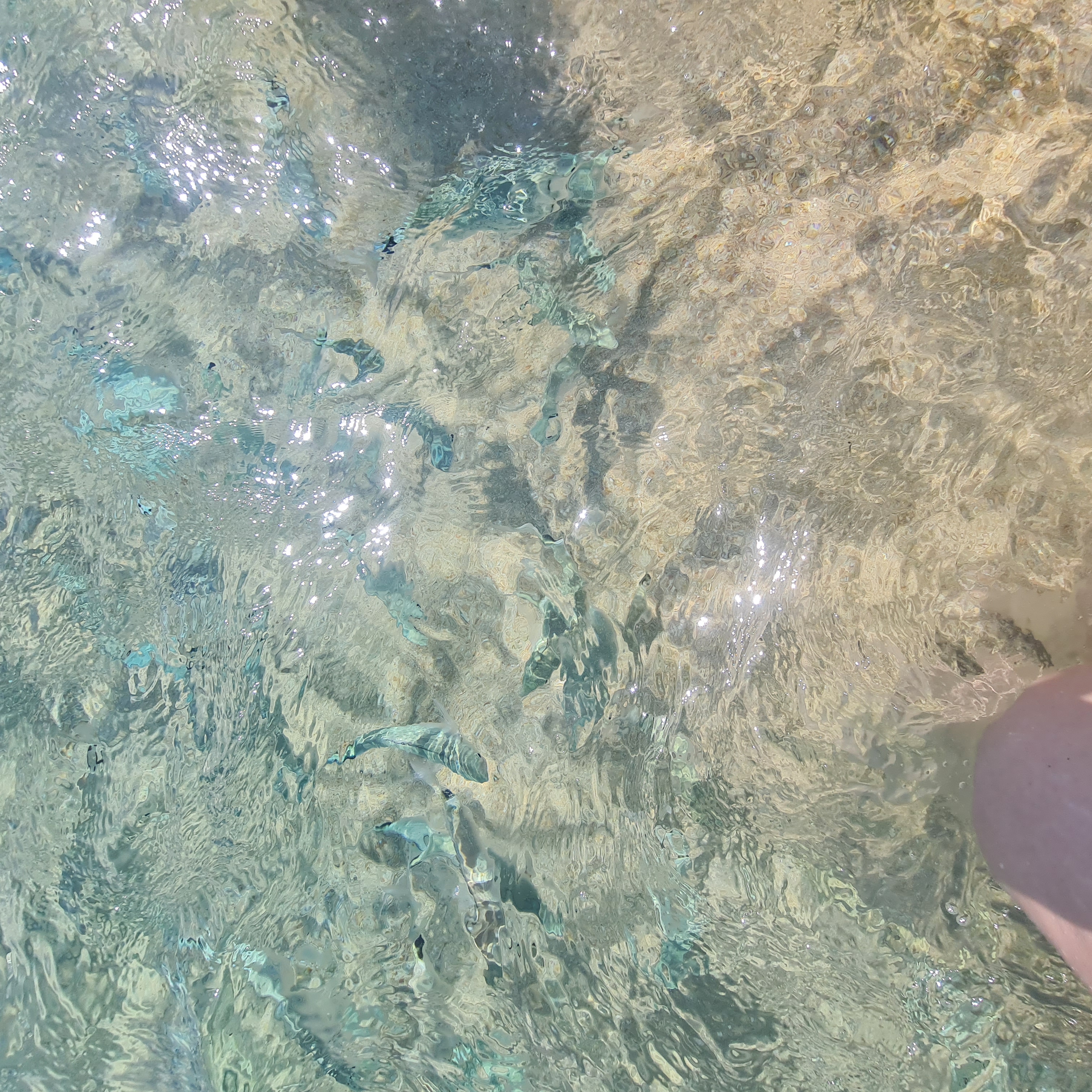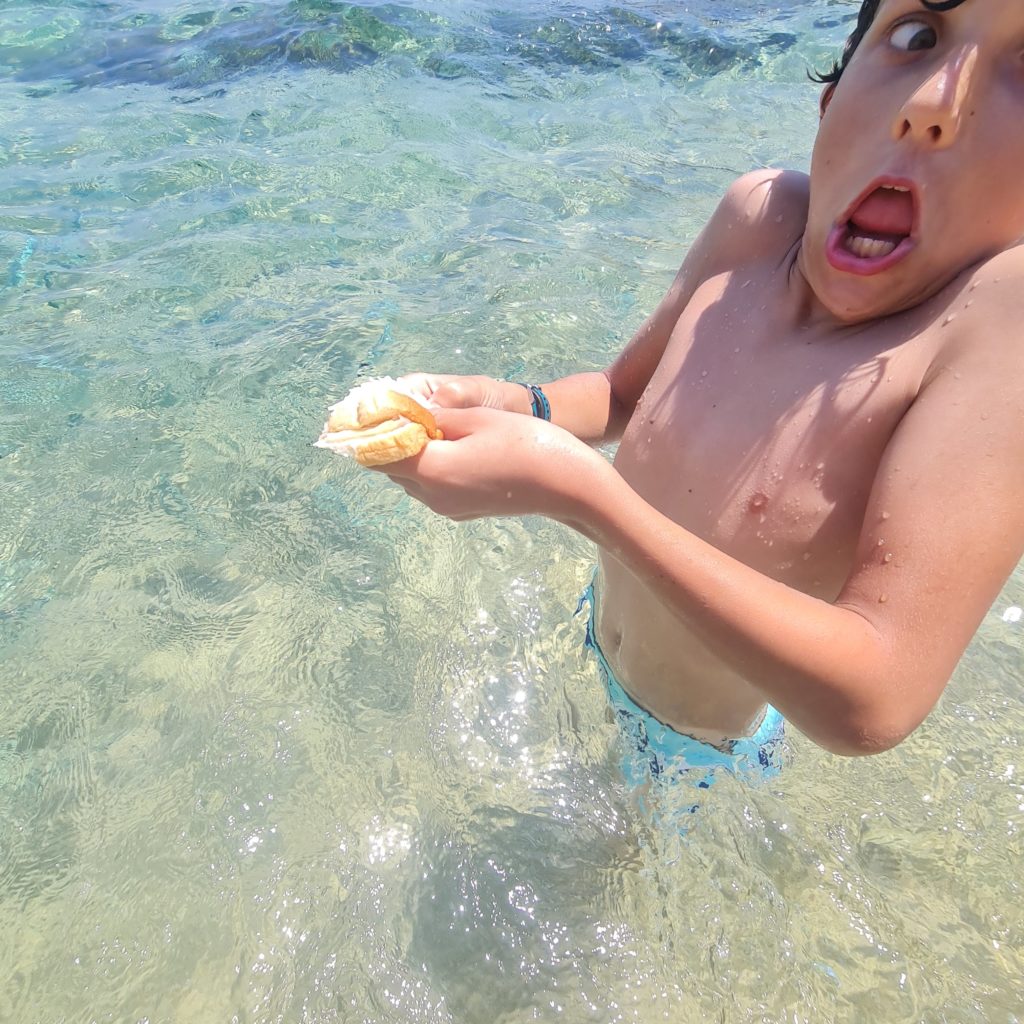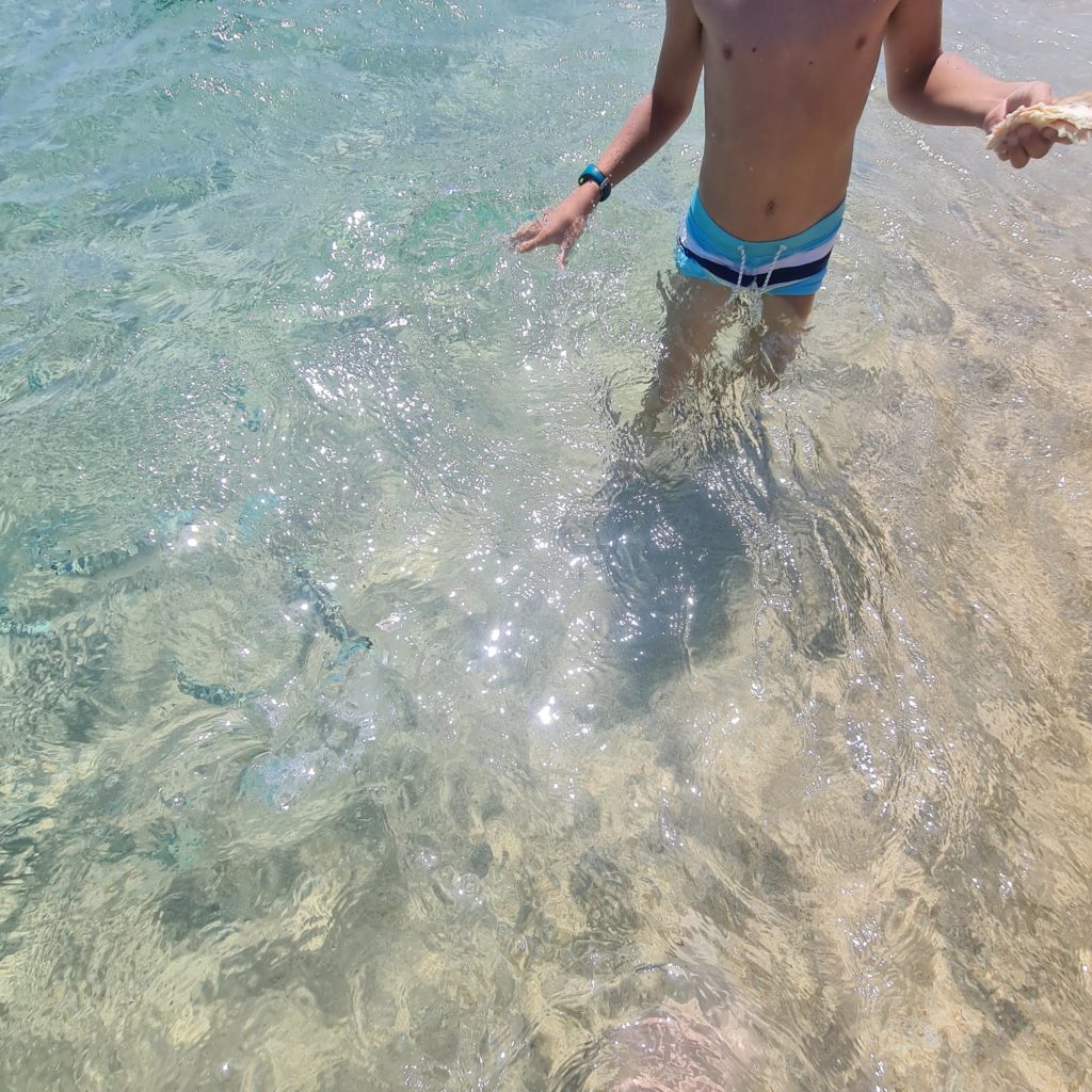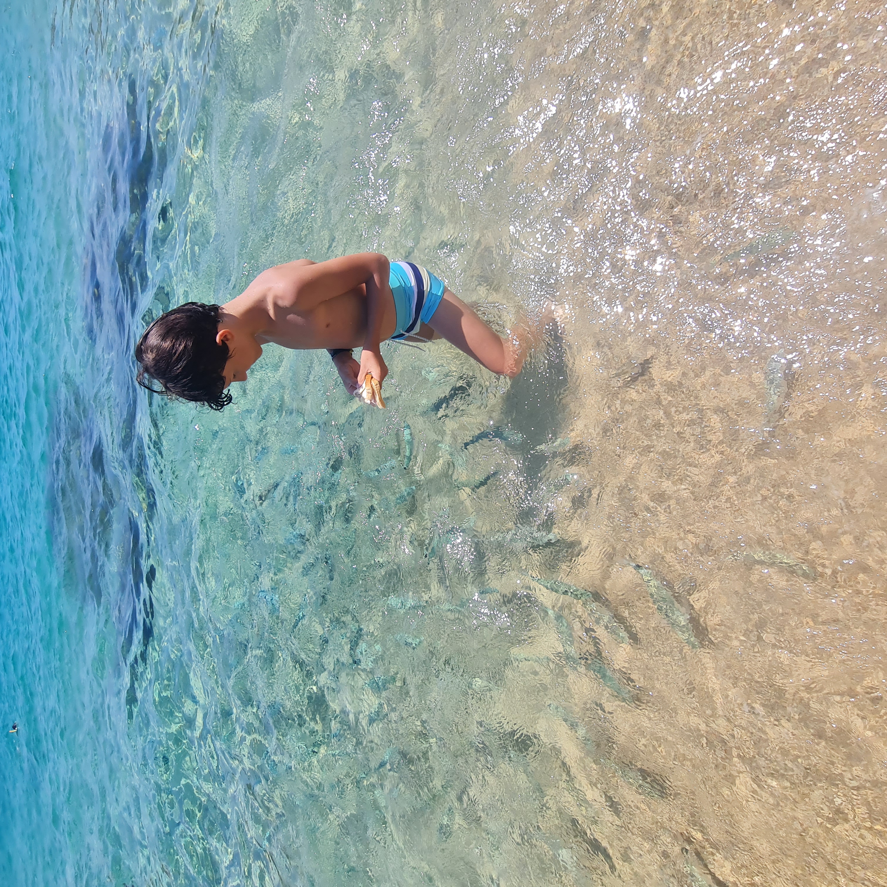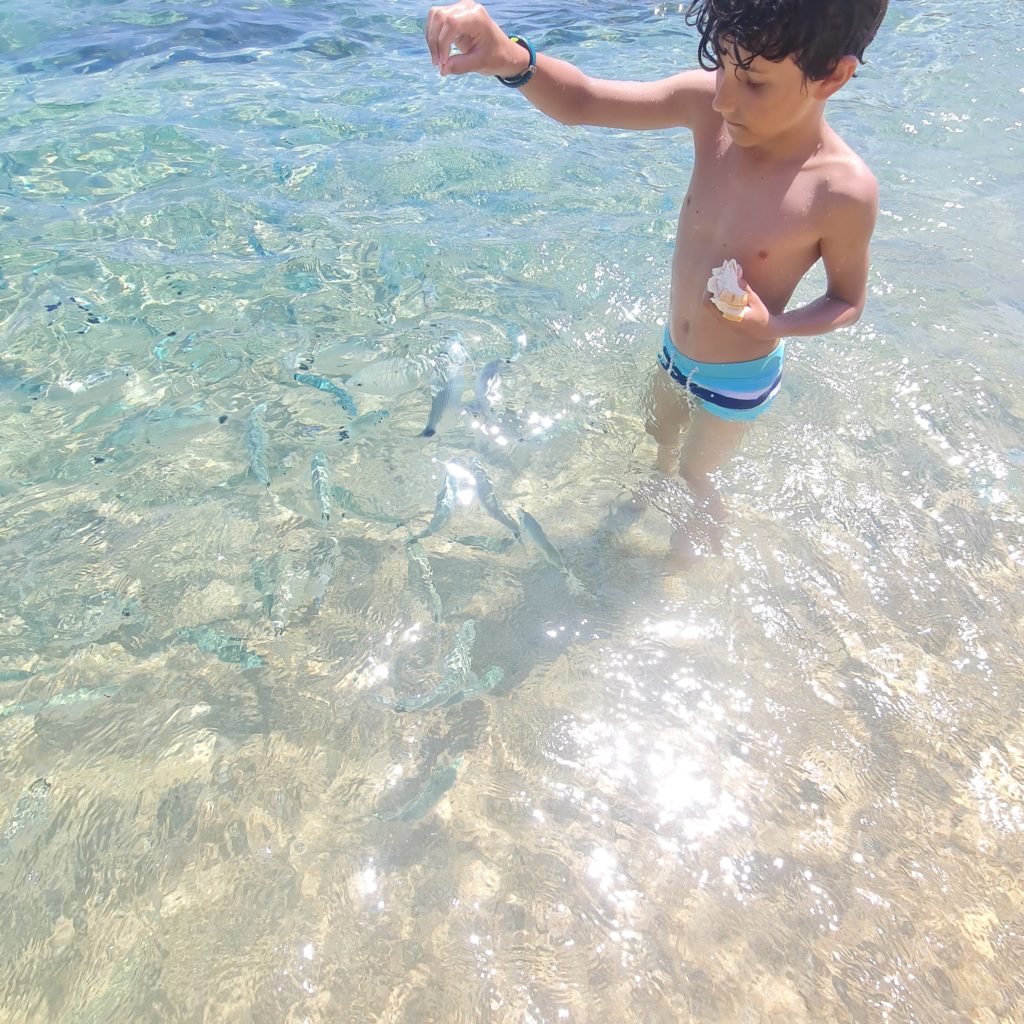 L’eau est limpide, bonne (même Éric s’est baigné !), il y a plein de poissons autour de nous ! Sacha leur donne ses restes de sandwiches, il est entouré de poissons !