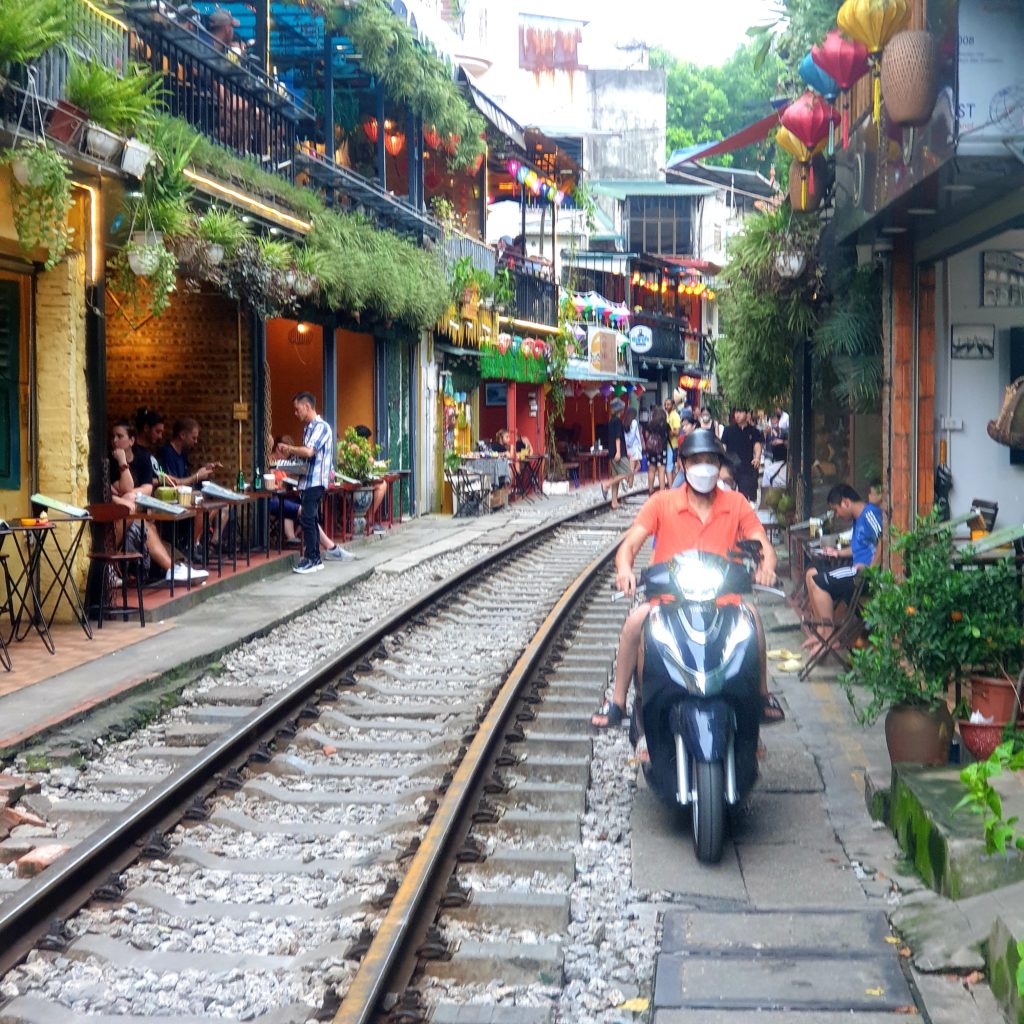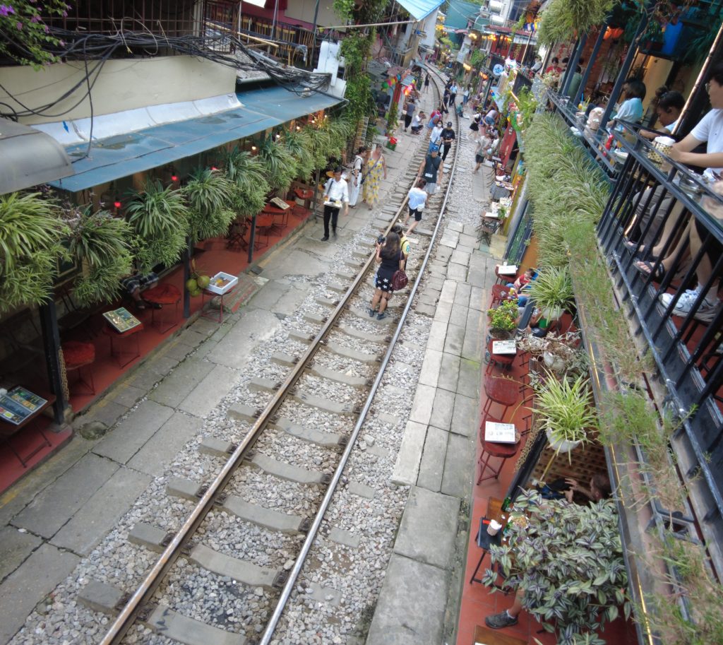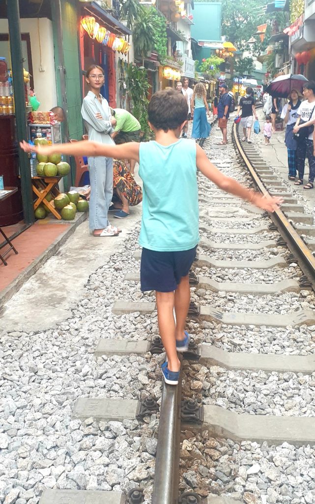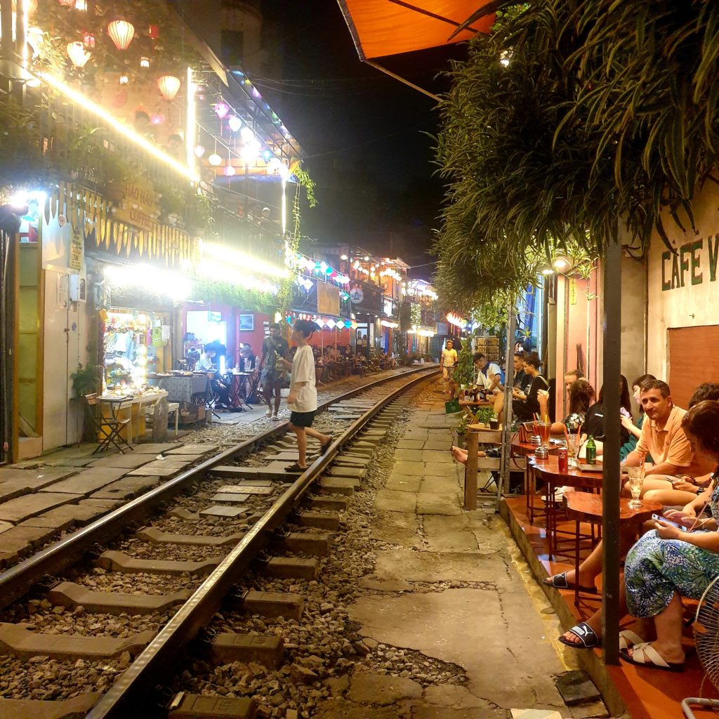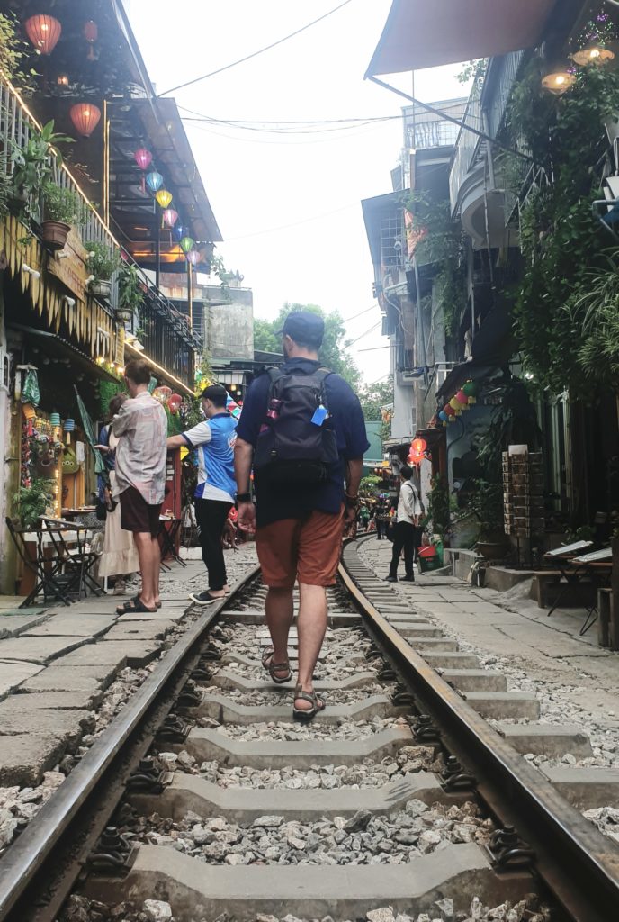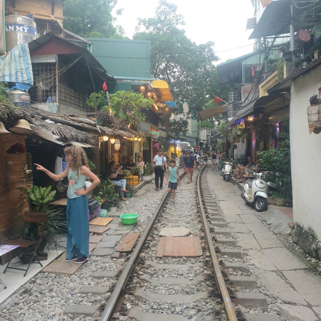 Nous nous baladons une bonne partie de la journée, nous mangeons des Bo Bun de la mort qui tue, achetons une énième valise pour ramener nos souvenirs, et nous nous arrêtons sur une célèbre voie ferroviaire (Train street) qui date de l’époque coloniale française et qui traverse la capitale. C’est fou, la rue est super étroite : il y a entre 4 et 5 mètres seulement entre les deux rangées d’habitation, juste de quoi laisser passer la locomotive et les wagons ! Il parait que lorsque les trains passent, ceux-ci frôlent carrément les maisons. On a attendu d’en voir passer un, mais beaucoup ont été annulés, on reviendra demain !