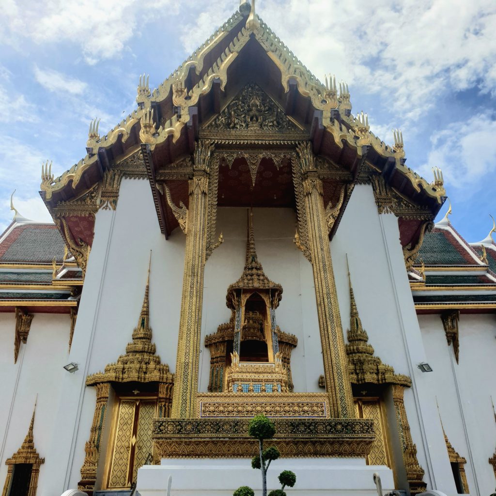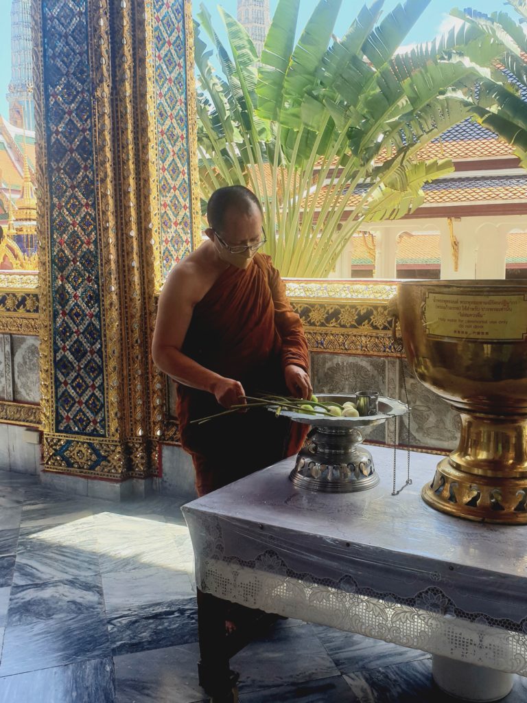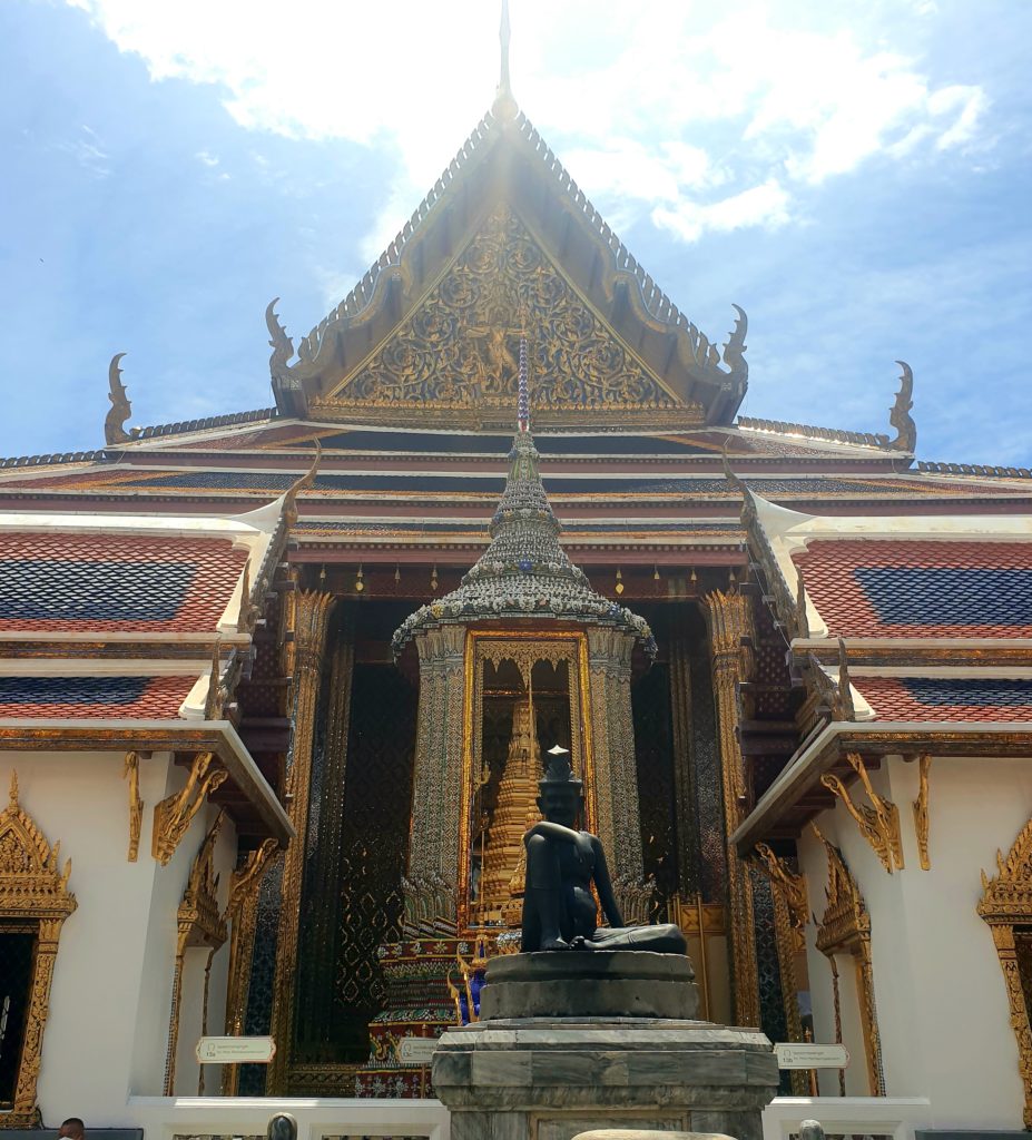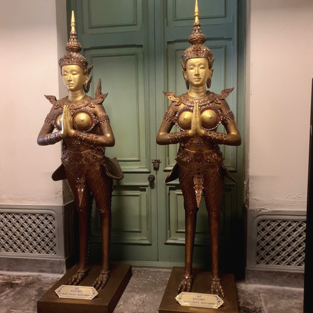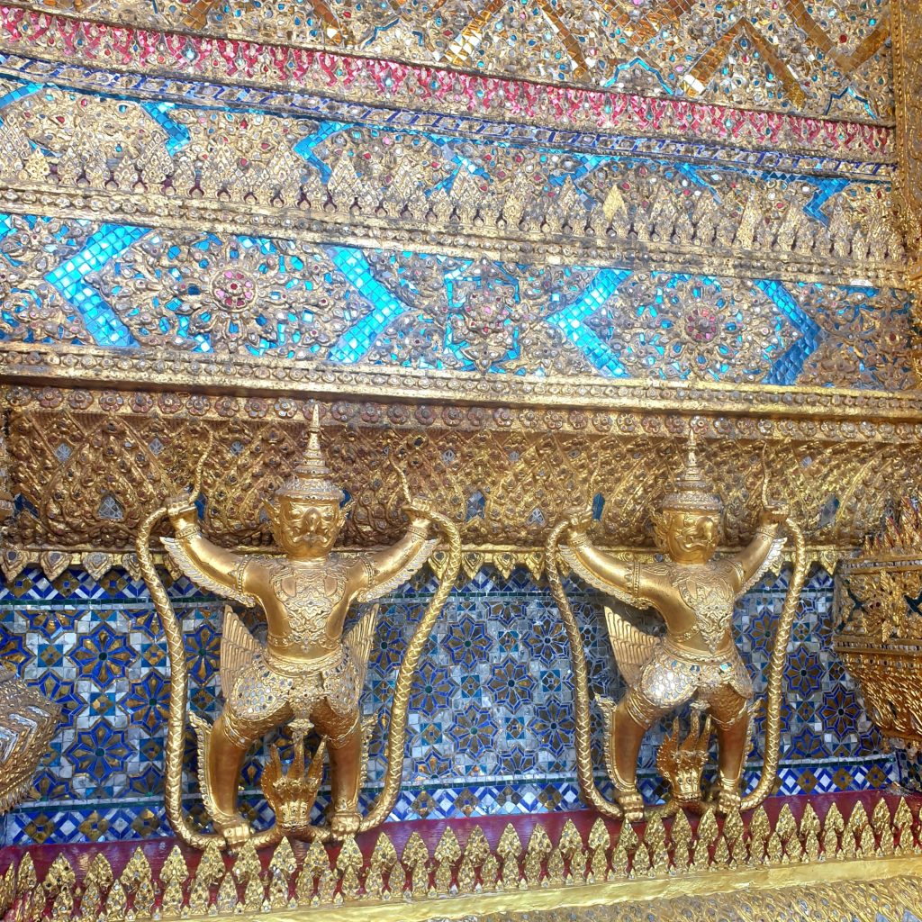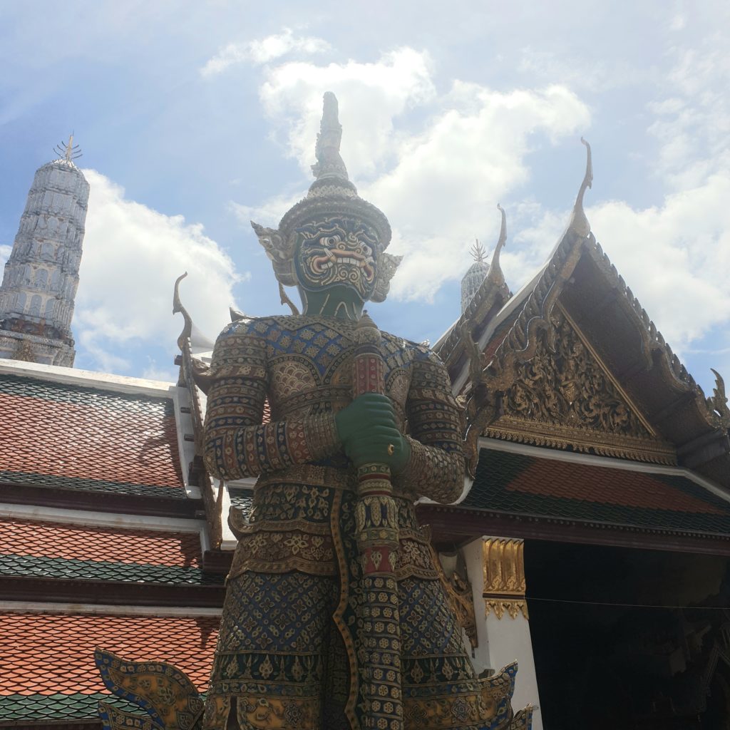 Comme à chaque visite de site religieux ou royal, on trouve d’immenses gardiens-démons (6m de haut tout de même) qui protègent le lieu des mauvais esprits. Ils ont tous le visage dirigé vers la chapelle royale afin de protéger particulièrement le Bouddha d’Emeraude, une sculpture d’une soixantaine de centimètres de haut (en réalité faite de jade) et qui a une histoire incroyable. Elle est la principale icône du pays et est considérée comme un talisman.