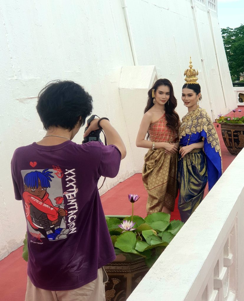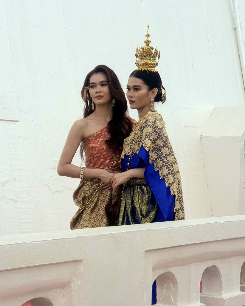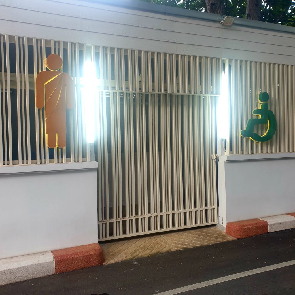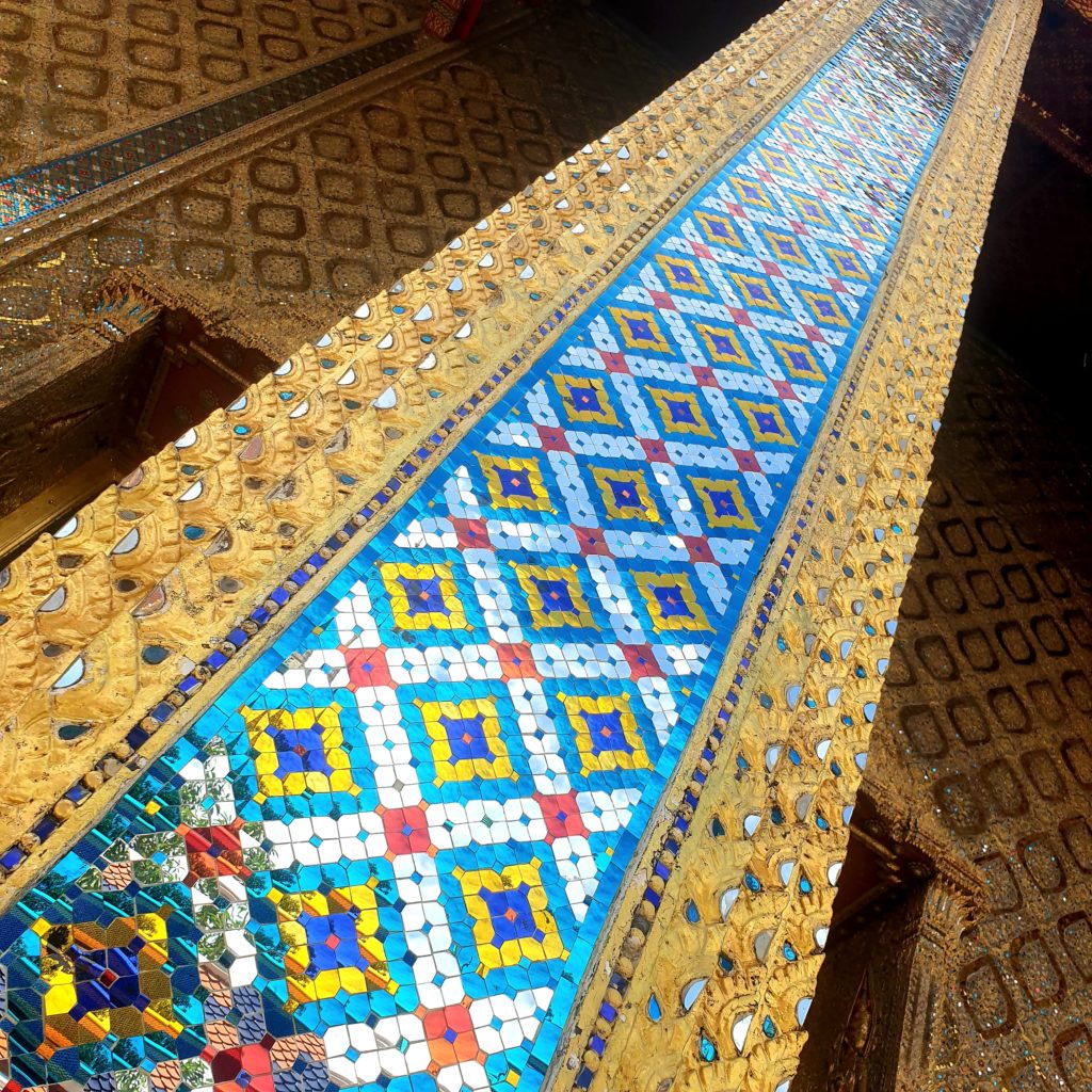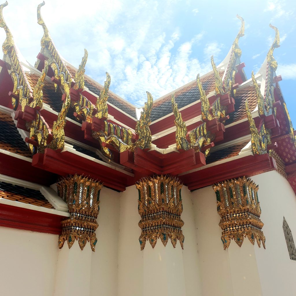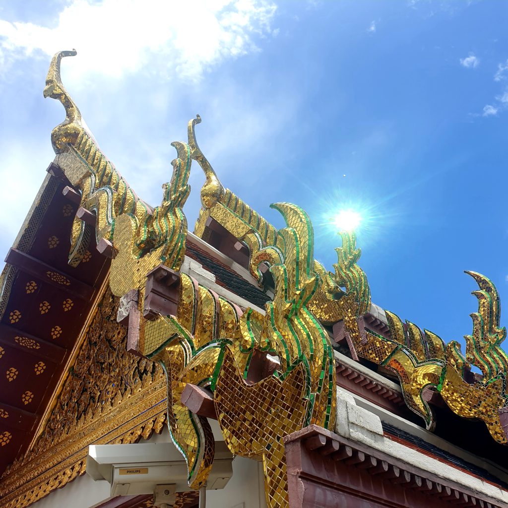 On reconnaît de suite les toits de style khmer, combiné au style thaï, recouvert de tuiles bleues et oranges. Les stupas dorés et les colonnes constellées de miroirs scintillent au soleil, ohhhh ! Moi, personnellement, j’adore et je ne me lasse pas d’admirer ces temples en gardant le nez en l’air !