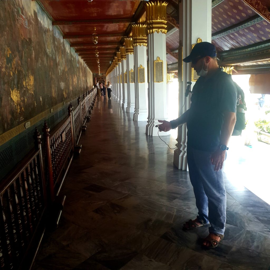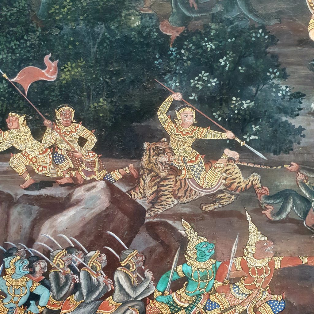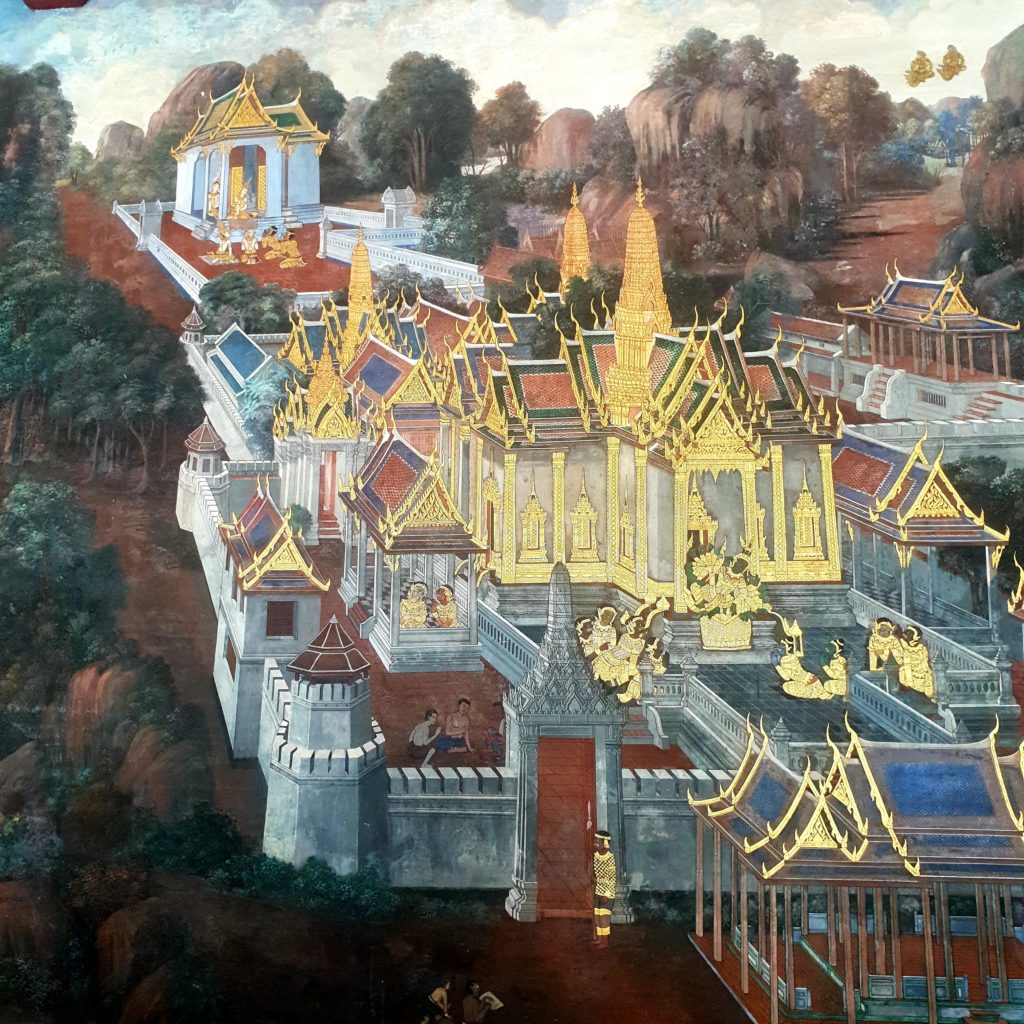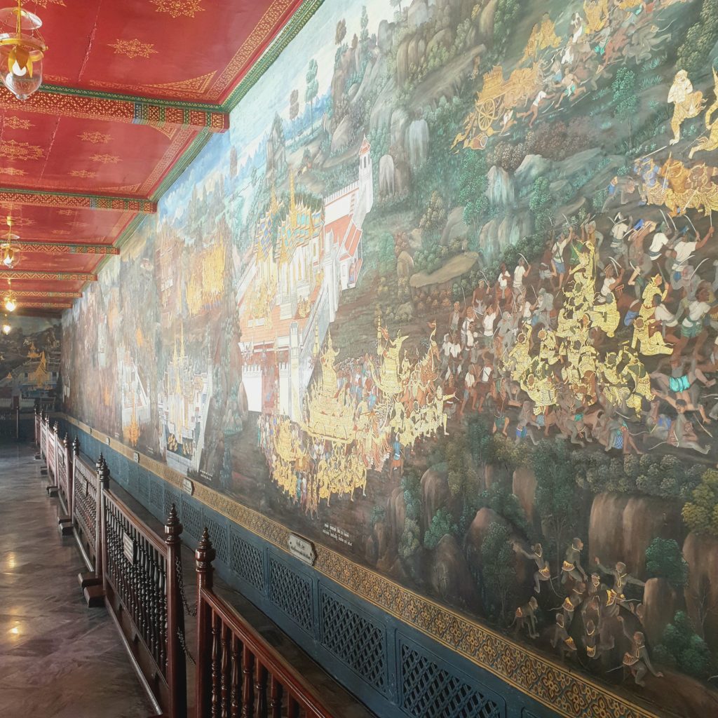 Autour du périmètre de constructions, on trouve une grande galerie entièrement peinte de fresques qui racontent la version thaïlandaise de la célèbre épopée indienne du Ramayana.