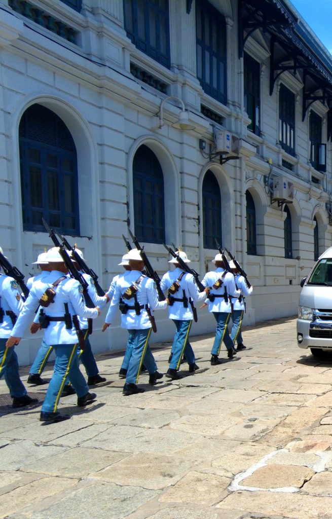 En sortant, on croise les gardes impeccables du palais, vêtus d’uniformes blancs immaculés, avec, covid et masque oblige, leur photo en grand épinglée sur leur torse…