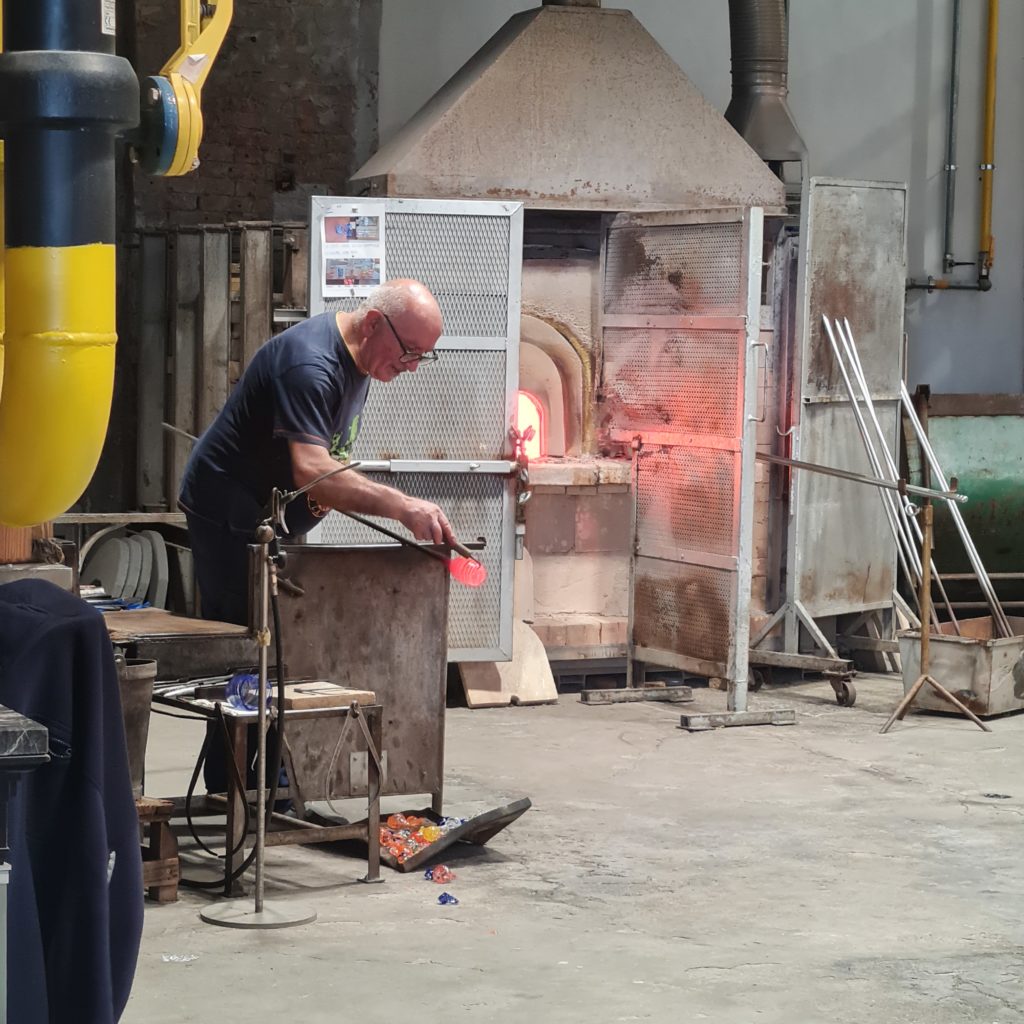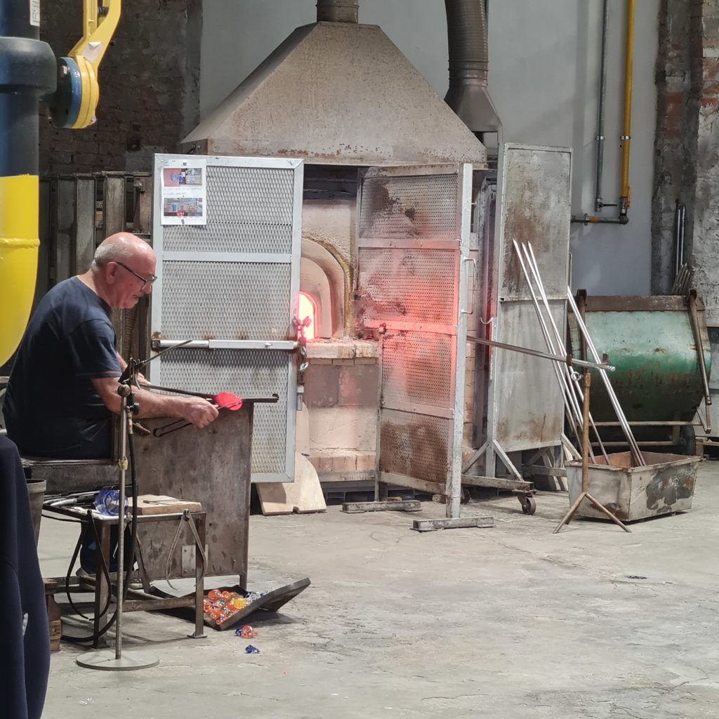 Alors, au mois d’août, comme il fait très chaud, la plupart des ateliers ne fonctionnent pas. Une fabrique nous propose d’aller voir à un petit prix comment travaillent les ouvriers (oui, regarder des souffleurs travailler est payant…) mais la personne est honnête et nous explique qu’il ne reste qu’une dizaine de minutes avant de fermer.