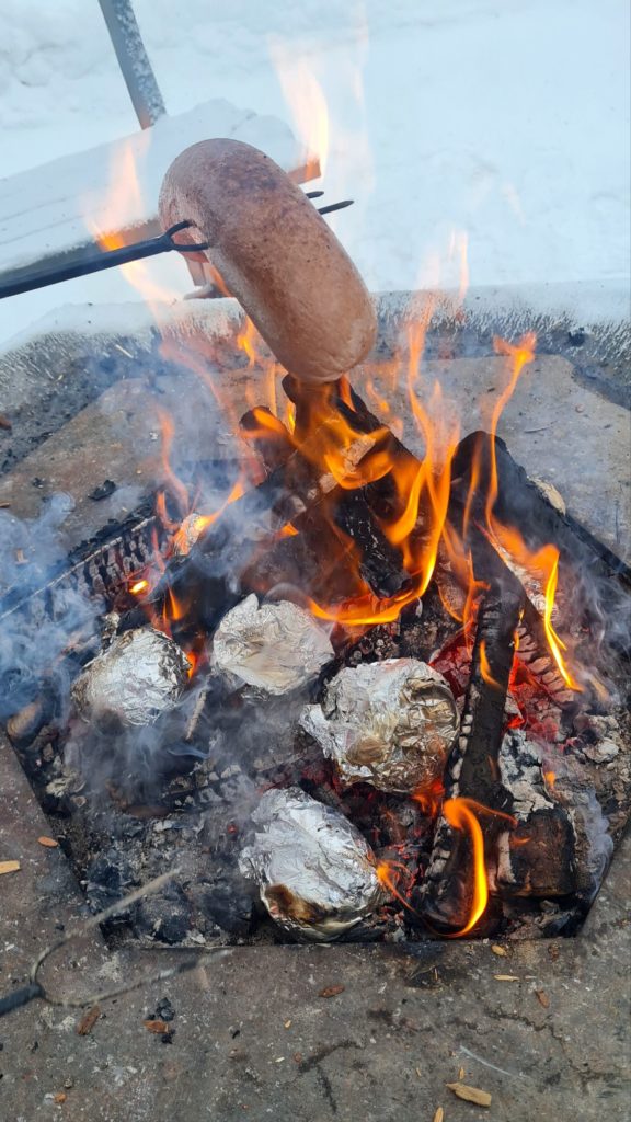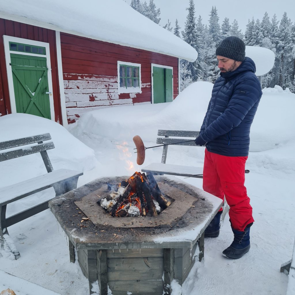 De retour après 2h30 de balade, je prépare le feu sur le brasero pendant qu’Eric allume le poêle du sauna. Au menu : pommes de terre cuites dans la braise et falukorv grillé !