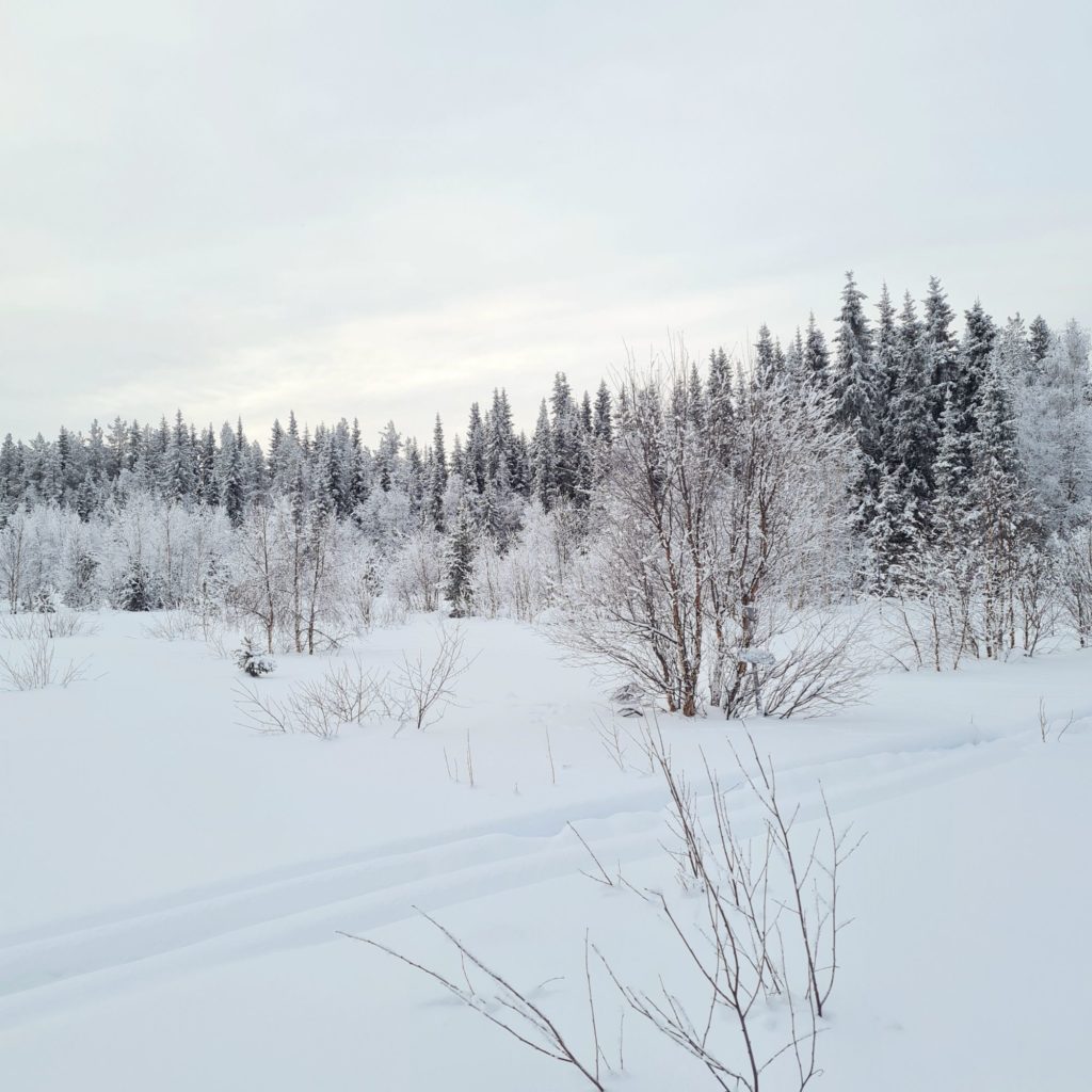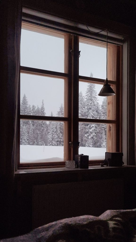 Se réveiller avec la vue sur la forêt enneigée est un pur plaisir ! Ce matin, il neigeotte, ce n’est pas grave, on a prévu une plus grande randonnée à ski, on va pouvoir quand même la faire.