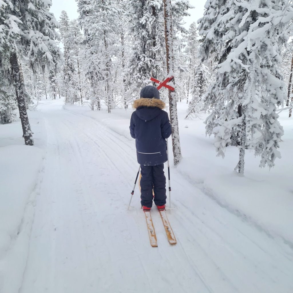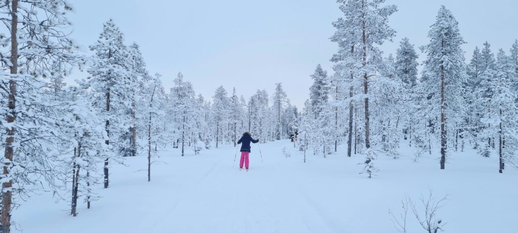 Nous suivons des sentiers à travers la forêt, en direction du village voisin. Nous croisons au milieu des bois, un vieux monsieur, habillé tout en treillis, et son chien de chasse. Il m’impressionne un peu de loin, mais une fois près de lui, il nous indique avec gentillesse et avec des gestes où poursuivre notre route et il me montre comment mieux attacher mes skis.