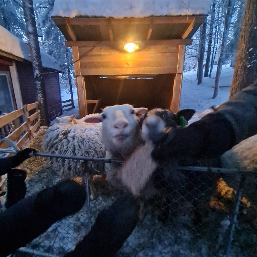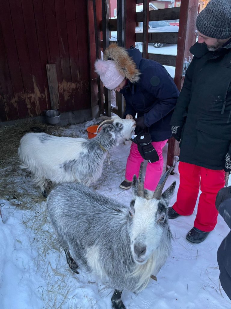 Il nous fait faire le tour de sa propriété, nous montre son poulailler, et nous présente ses poules, enfermées d’octobre à mai car elles n’aiment pas la neige ! Nous nourrissons avec du pain (des Wasa !) ses 2 chèvres blanches et grises à poils longs, ses moutons.