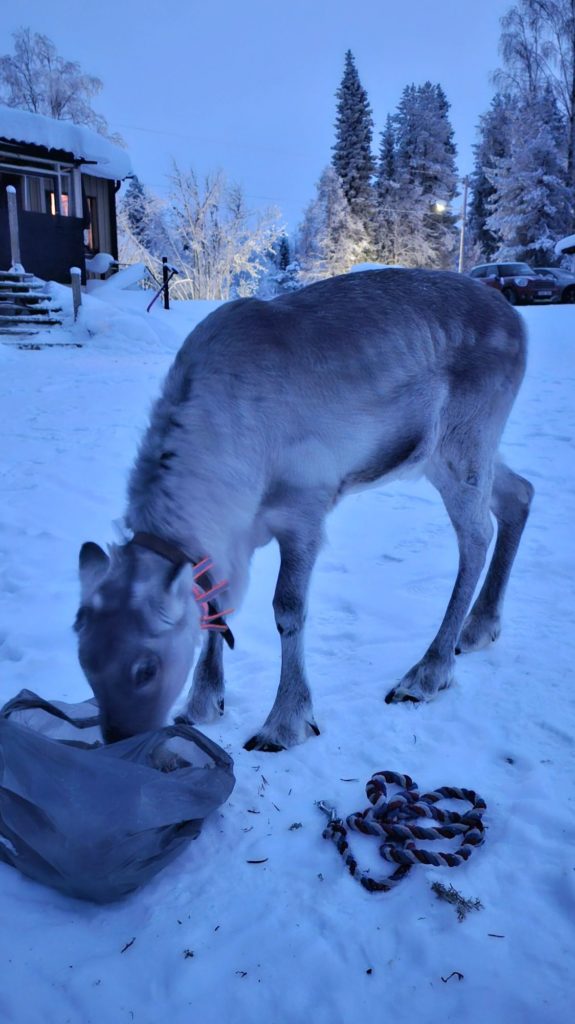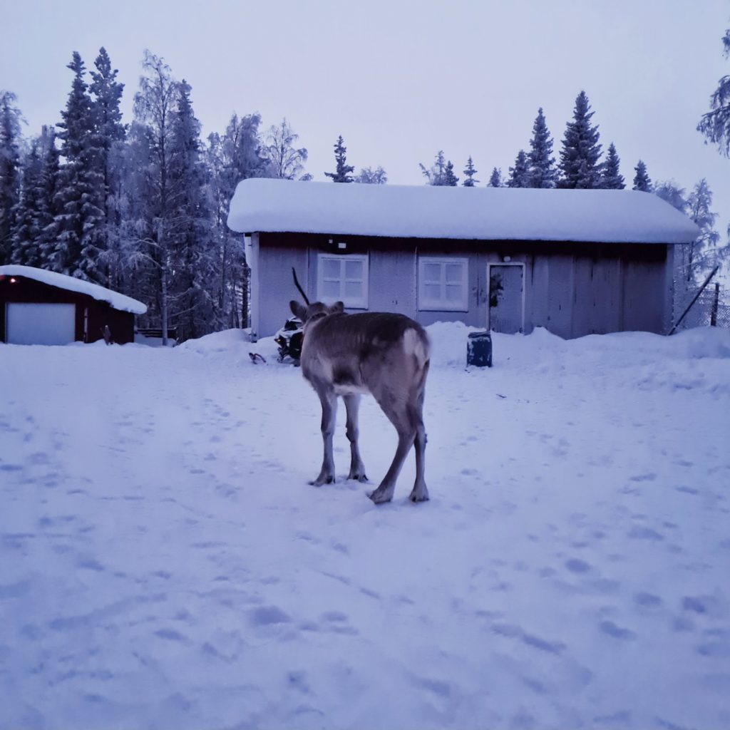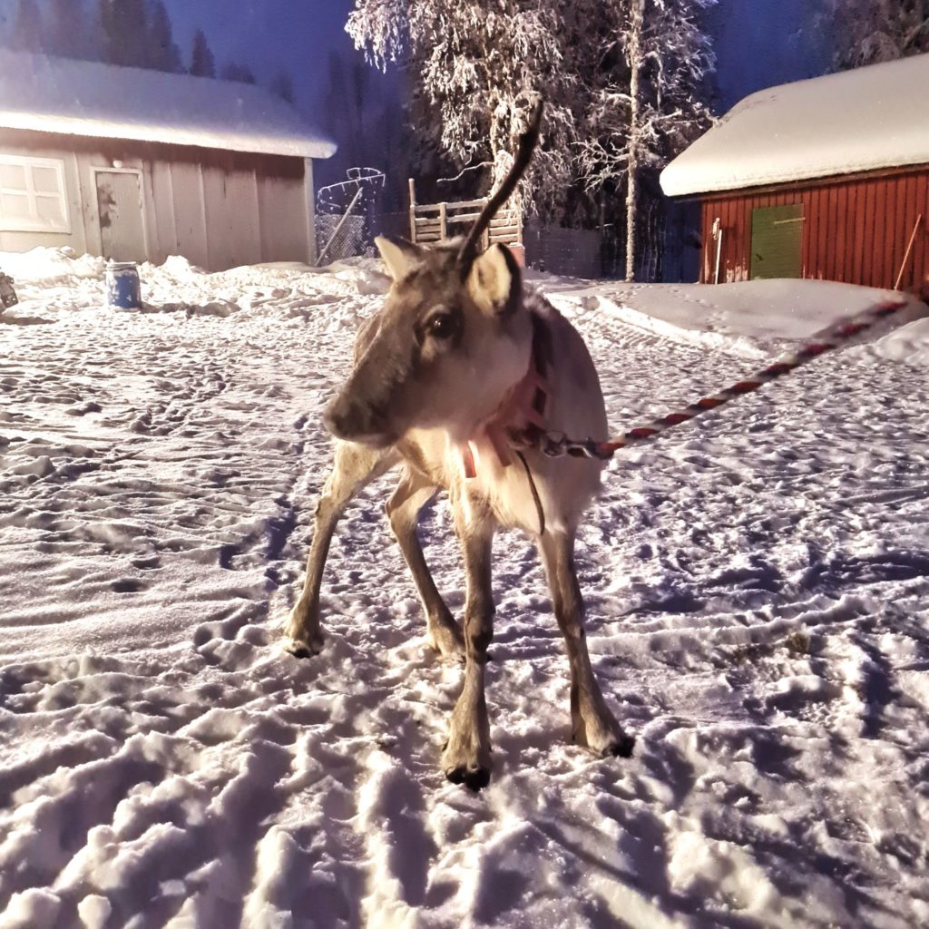 Cette jeune femelle a été trouvée gelée près de la rivière où elle était tombée. Pour la sauver, ils l’ont ramenée chez eux et l’ont réchauffée, soignée et nourrie. Elle est avec eux depuis novembre et elle nous explique qu’elle va devoir la réintégrer au troupeau de son frère qui est éleveur. Micke est persuadé qu’elle ne le fera jamais car aujourd’hui, cette petite renne la suit comme un chien et est très attachée à elle.