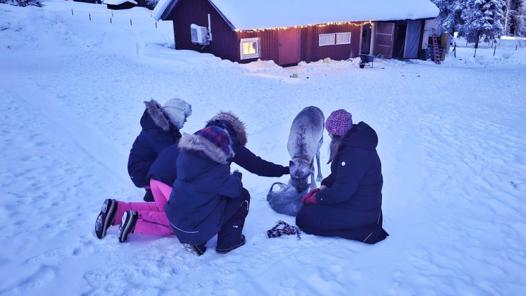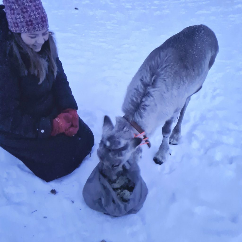Lorsque nous arrivons, son amie nous attend avec un jeune renne. Elle nous explique d’abord qu’il faut se mettre à genoux pour pouvoir approcher son renne qui est un animal craintif.