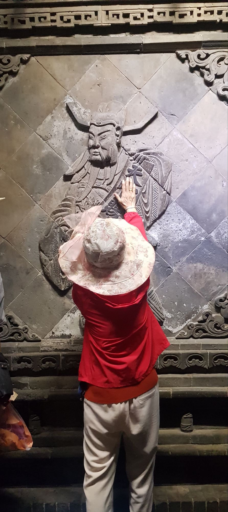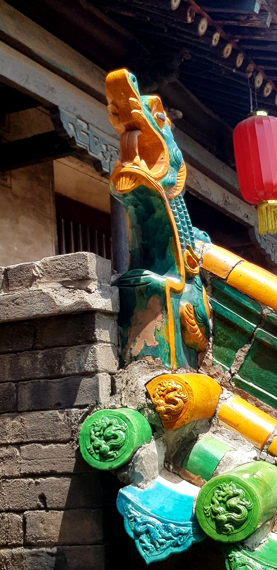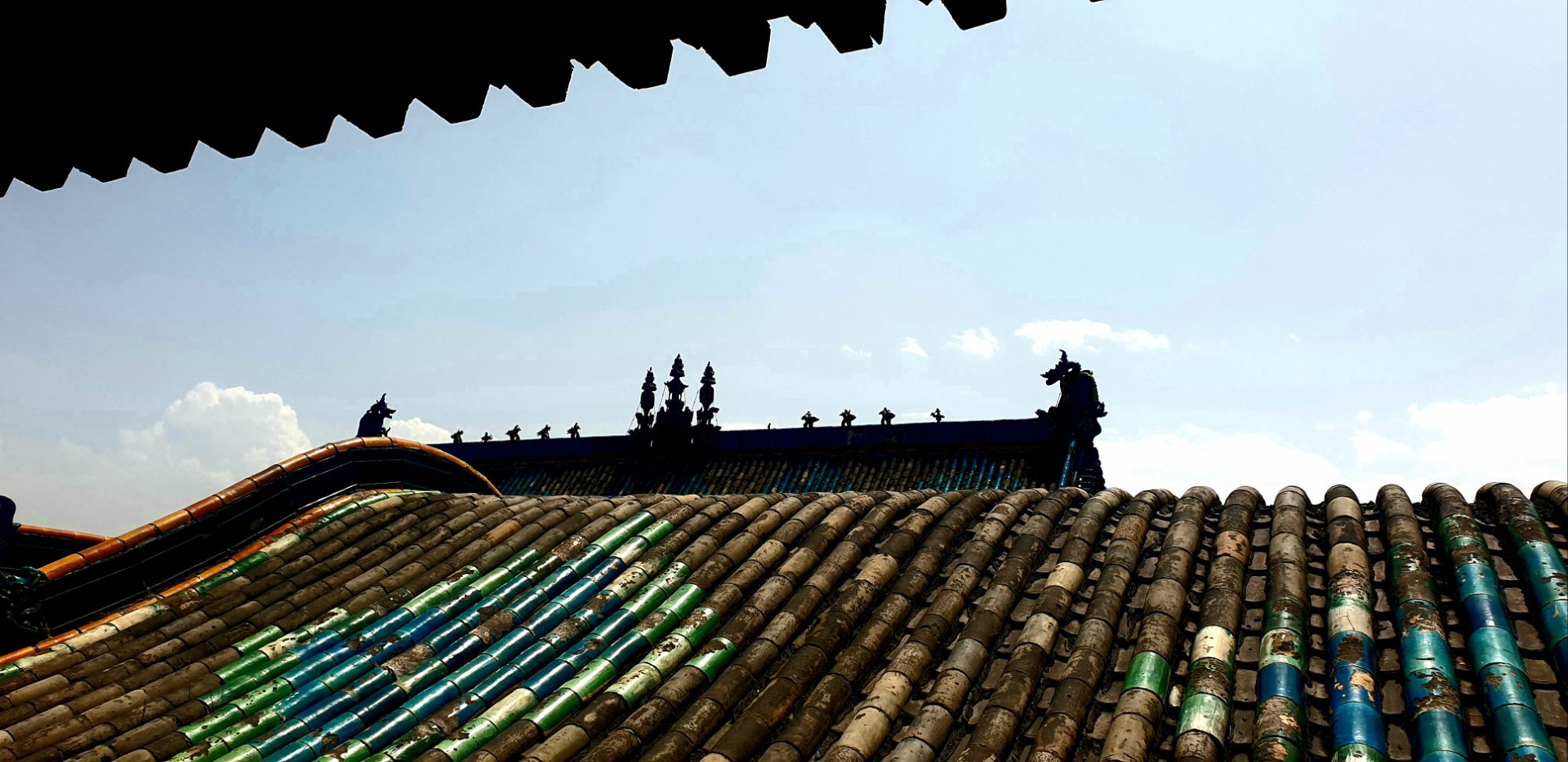 La porte Sud à laquelle nous arrivons enfin et superbe ! On y retrouve tous les éléments de l’architecture des toits en pagode : tuiles vernissées, poutres peintes et sculptées, faîtières ouvragées, sculptures de dragons qui protègent le bâtiment, etc…